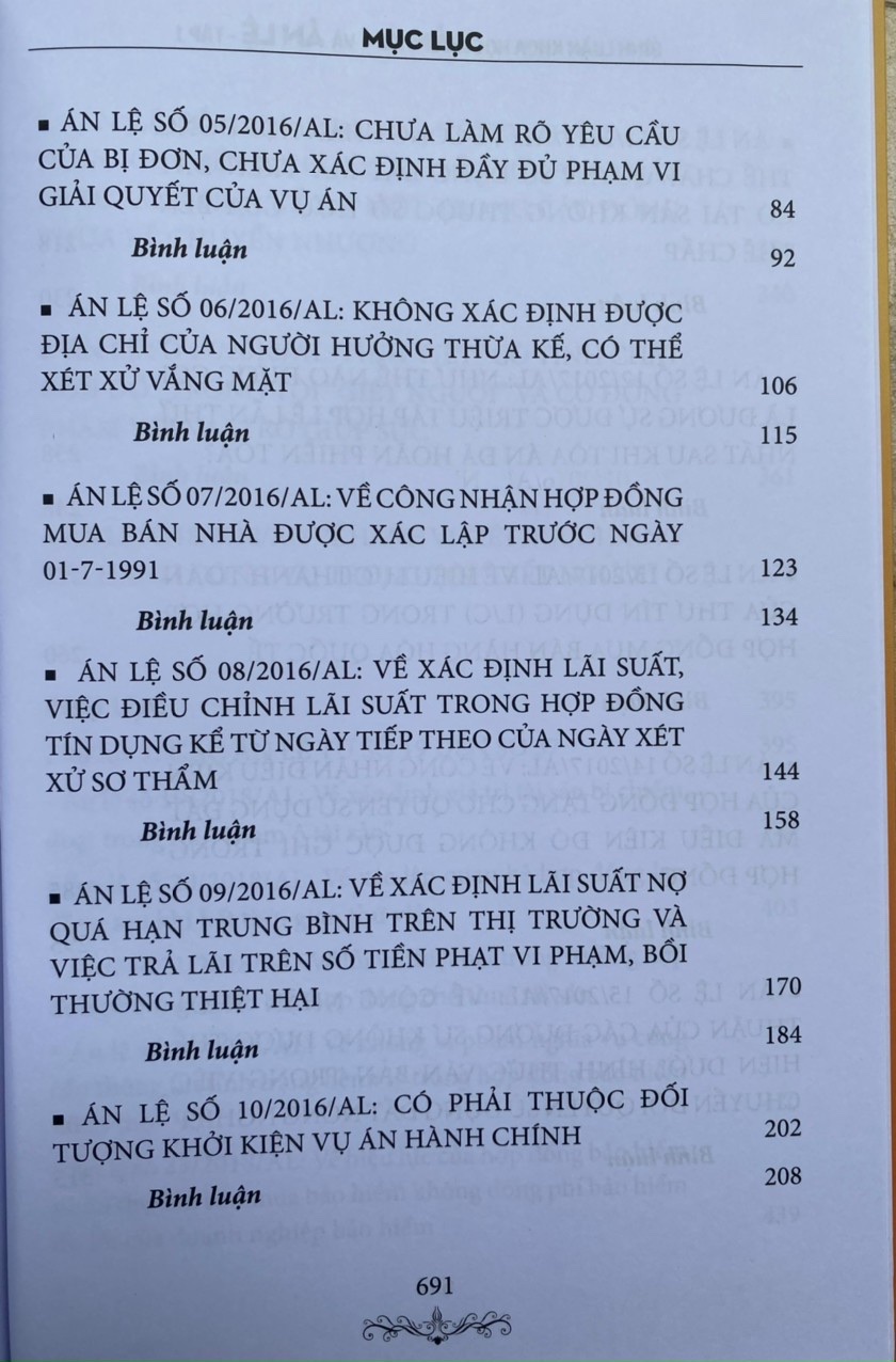 Hy vọng cuốn sách sẽ đáp ứng được phần nào nhu cầu của đông đảo bạn đọc, trước hết là các cán bộ trong các cơ quan tư pháp, các luật sư, các nhà nghiên cứu, các giảng viên, sinh viên luậ trong việc tìm hiểu, nghiên cứu, tham khảo, ứng dụng các án lệ đã được công bố; đồng thời, giúp người dân có thêm vốn kiến thức pháp luật về các tình huống tranh chấp được chọn là án lệ, có thể tự bảo vệ quyền và lợi ích hợp pháp của mình một cách tốt nhất .