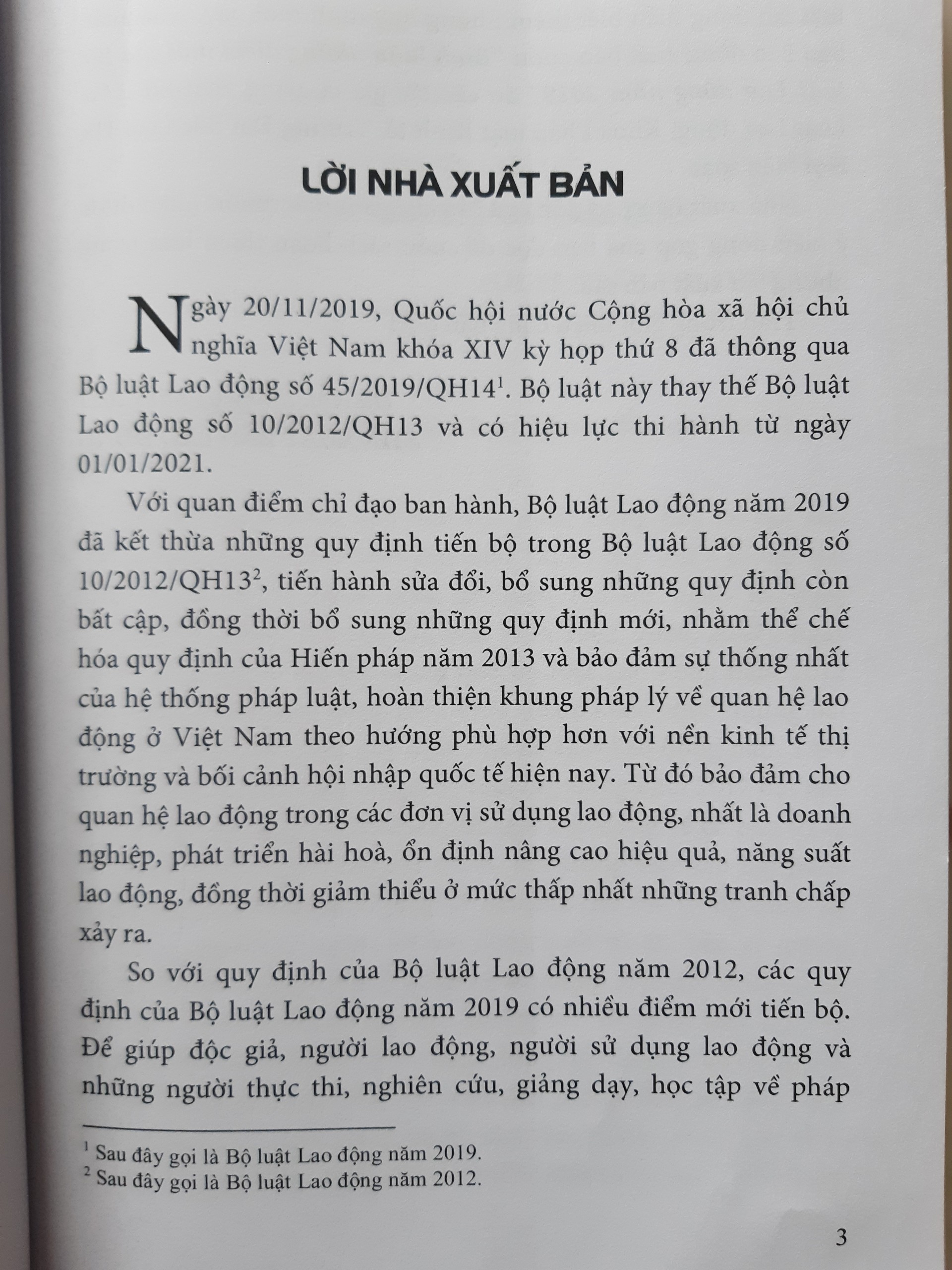 Ngày 20/11/2019, Quốc hội nước Cộng hòa xã hội chủ TV nghĩa Việt Nam khóa XIV kỳ họp thứ 8 đã thông qua Bộ luật Lao động số 45/2014/QH14. Bộ luật này thay thế Bộ luật Lao động số 10/2012/QH13 và có hiệu lực thi hành từ ngày 01/01/2021. Với quan điểm chỉ đạo ban hành, Bộ luật Lao động năm 2019 đã kết thừa những quy định tiến bộ trong Bộ luật Lao động số 10/2012/QH133, tiến hành sửa đổi, bổ sung những quy định còn bất cập, đồng thời bổ sung những quy định mới, nhằm thể chế hóa quy định của Hiến pháp năm 2013 và bảo đảm sự thống nhất của hệ thống pháp luật, hoàn thiện khung pháp lý về quan hệ lao động ở Việt Nam theo hướng phù hợp hơn với nền kinh tế thị trường và bối cảnh hội nhập quốc tế hiện nay. Từ đó bảo đảm cho quan hệ lao động trong các đơn vị sử dụng lao động, nhất là doanh nghiệp, phát triển hài hoà, ổn định nâng cao hiệu quả, năng suất lao động, đồng thời giảm thiểu ở mức thấp nhất những tranh chấp xảy ra. So với quy định của Bộ luật Lao động năm 2012, các quy định của Bộ luật Lao động năm 2019 có nhiều điểm mới tiến bộ. Để giúp độc giả, người lao động, người sử dụng lao động và những người thực thi, nghiên cứu, giảng dạy, học tập về pháp luật lao động hiểu biết thêm những quy định mới này, Nhà xuất bản Lao động xuất bản cuốn “Bình luận những điểm mới của luật Lao động năm 2019” do các tác giả là giảng viên Bộ Luật Lao động, Khoa Pháp luật Kinh tế, Trường Đại học Luật Hà Nội biên soạn.