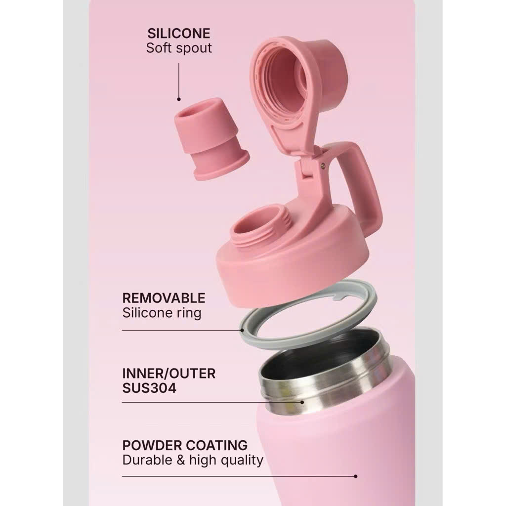 - Thép không gỉ 304 hợp vệ sinh - Nắp vặn không lo lắng về việc rò rỉ nước - Quai xách silicone thuận tiện mang đi và có thể tháo rời giúp dễ dàng