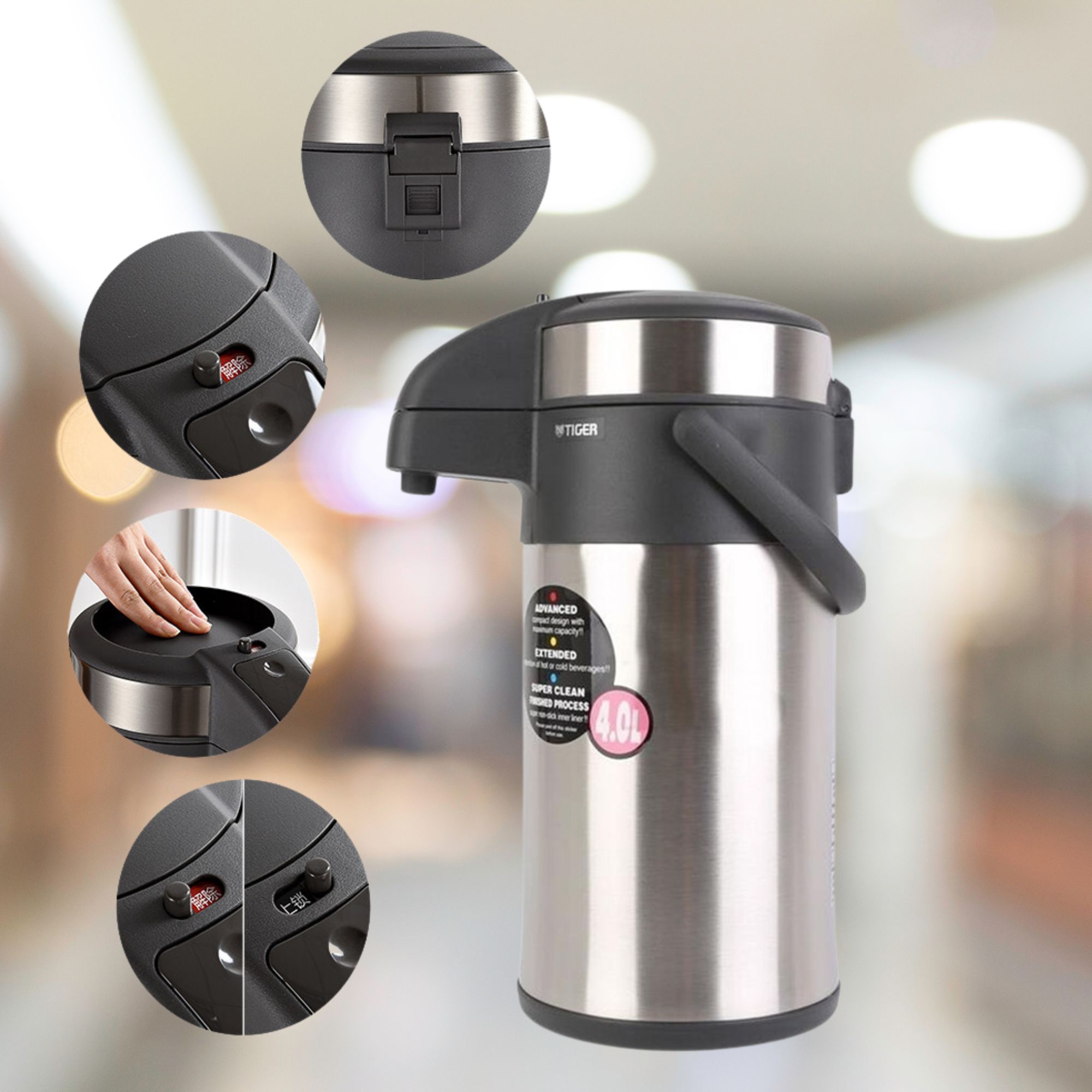 Bình thủy chứa Tiger có nắp khóa an toàn, rót nước bằng cách nhấn vào pittông trên nắp, đế xoay 360 độ giúp việc sử dụng bình trở nên an toàn hơn và giữ được hương vị của thức uống.