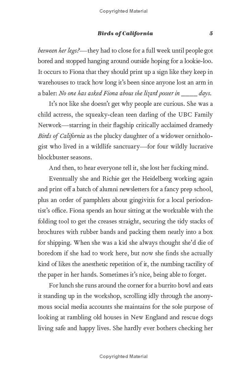 Unlike Fiona, Sam Fox, who played her older brother on the popular television show Birds of California, loves the perks that come with being a successful Hollywood actor: fame, women, parties, money. When his current show gets cancelled and his agent starts to avoid his calls, the desperate actor enthusiastically signs on for a Birds of California revival. But to make it happen, he needs Fiona St. James.