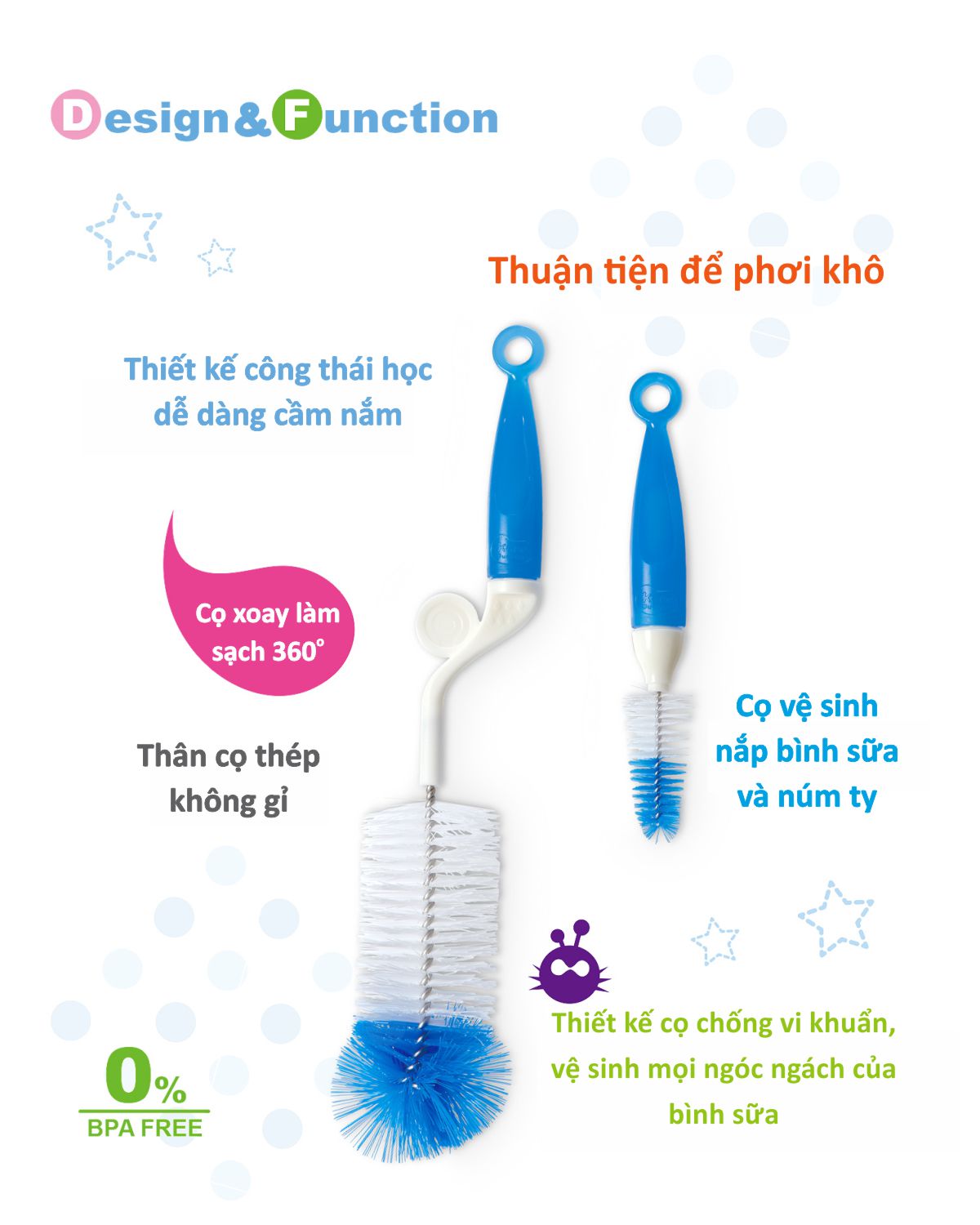 Bộ 2 Cọ Rửa Bình Sữa 360° Kuku KU5480 sẽ giúp bạn làm sạch mọi vết bám bẩn trên bình và phụ kiện bình uống một cách dễ dàng nhờ thiết kế khoa học và tiện