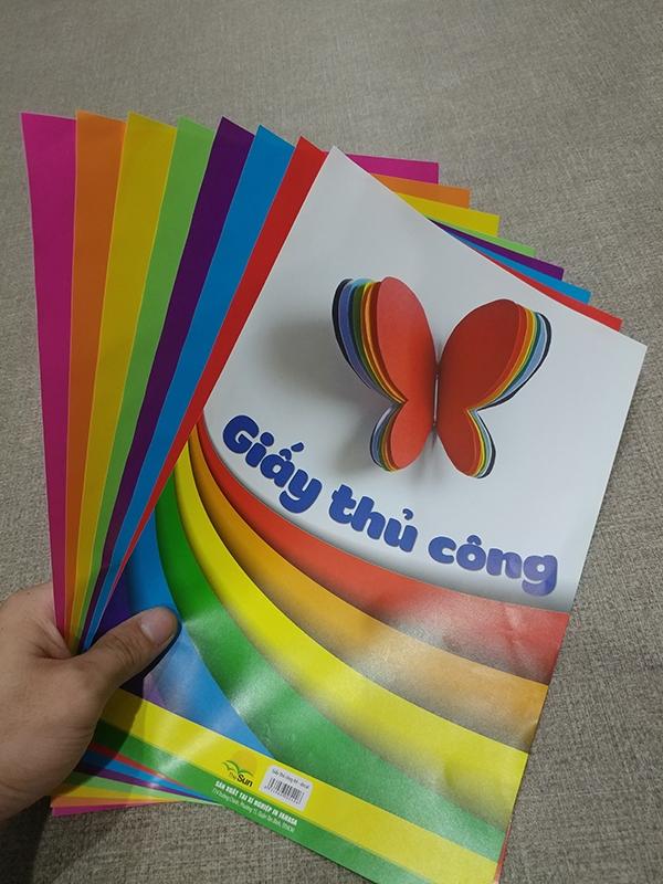 Giấy thủ công có bề mặt bóng, mịn màu sắc sinh động gồm 7 màu chủ đạo: đỏ, vàng, hồng, tím, xanh lá, cam, xanh dương đáp ứng tối đa nhu cầu sáng tạo.