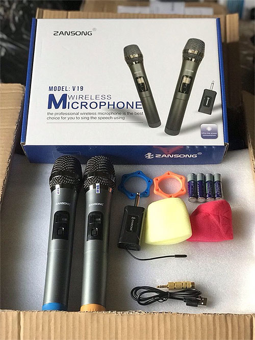 Bộ Micro không dây zansong V19 là một sản phẩm có thiết kế đặc biệt cho ứng dụng Karaoke.Tần số đáp ứng phù hợp cho giọng hát với tầm trung dầy và ấm, kiểm soát dải tần số cao, giảm thiểu hiện tương phản hồi âm thanh,làm cho hiệu suất âm thanh hoàn hảo hơn. Với mọi bộ  thường phải đi kèm với một đầu thu rất cồng kềnh,  có thiết kế đột phá gọn nhẹ tính di động cao ta chỉ cần cắm đầu thu nhỏ gọn của bộ míc vào các thiết bị âm thanh là ta có thể thỏa sức ca hát, với khoảng cách thu bắt sóng lên tới 20m. Âm thanh chuẩn xác Bộ Microphone không dây Zangsong V19 được thiết kế để hạn chế tối đa hiện tượng âm thanh bị nhiễu loạn, Âm thanh chuẩn xác và ít bị bể tiếng nhất. Zangsong V19 được trang bị hệ thống điều chỉnh âm lượng trên bộ tiếp sóng Công tắc On/Off nằm giữa thân micro Phím điều khiển On/Off được bố trí ngay giữa thân micro có màn led hiển thị tần số mic rất đẹp ( hình trên) , chỉ cần gạt tay lên xuống là có thể tắt bật âm thanh, rất tiện lợi. Dùng cho nhiều mục đích khác nhau Microphone không dây Zangsong V19 có thể dùng để hát karaoke, nói chuyện trong nhà, trên sân khấu và ngay cả ngoài trời. Phụ kiện di theo bộ mic gồm: 2 Micro, 1 bộ thu phát tín hiệu, 1 cab sạc, 2 đôi pin A, 1 đầu cắm chuyển đổi tặng thêm bông lọc âm và đế chống lăn.