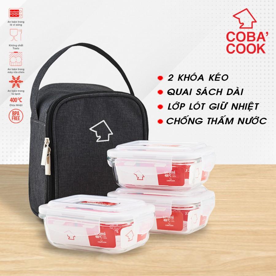 Bộ 3 hộp đựng cơm thủy tinh COBA'COOK chịu nhiệt 3 hộp chữ nhật 370ml và 1 túi simili - CCL33BS-1