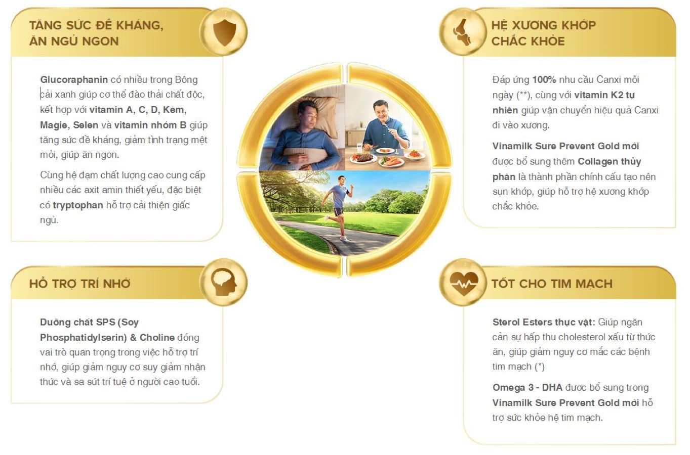 Người cao tuổi có xu hướng ăn ít hơn, ăn không thấy ngon miệng do những thay đổi sinh lý khi về già. Do đó, sữa dinh dưỡng là lựa chọn phù hợp cần được bổ sung vào chế độ dinh dưỡng hàng ngày để duy trì tình trạng sức khỏe tốt, sữa dành cho người lớn tuổi phải cung cấp đầy đủ, cân đối như: chất đạm, chất béo tốt, chất xơ, cholesterol thấp, vitamin và khoáng chất quan trọng khác. Sure Prevent Gold là món quà sức khỏe tuyệt vời dành tặng cho người thân yêu, đặc biệt là cha mẹ giúp bổ sung thêm dưỡng chất vào chế độ ăn nhằm duy trì và cải thiện tình trạng dinh dưỡng. Sure Prevent Gold giúp tăng cường sức khỏe tổng thể với dinh dưỡng dễ hấp thu bao gồm 29 vitamin và khoáng chất bổ sung vào chế độ ăn, đáp ứng 100% hàm lượng Plant Sterol theo khuyến nghị của FDA Hoa Kỳ, giúp phục hồi sức khỏe cho người bệnh, người cao tuổi, người ăn uống kém
