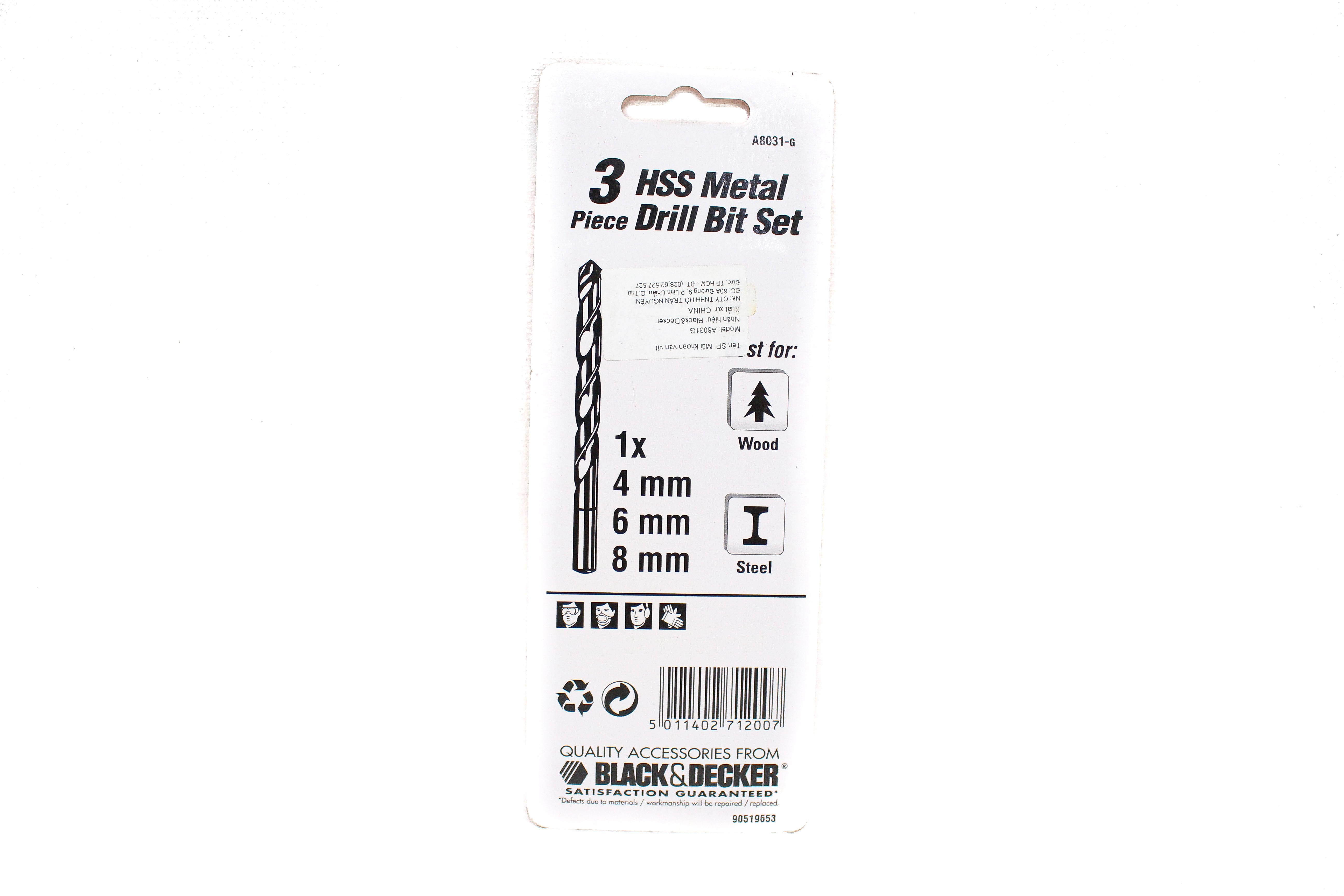 Bộ 3 Mũi khoan sắt HSS A8031GChất liệu siêu cứng, siêu bềnBộ mũi khoan sắt, gỗ 3 chi tiết Black Decker A8031G được làm bằng hợp kim thép có độ bền cơ học cao cho bạn yên tâm sử dụng trong thời gian dà...