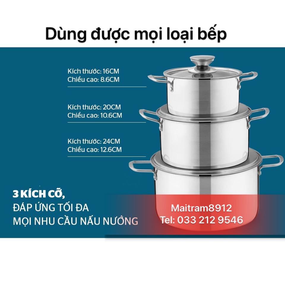• Bộ nồi Inox cao cấp 5 món 10 thứ: + Nồi cao cấp có nắp kích thước 16x9.5cm + Nồi cao cấp có nắp kích thước 18x10.5cm + Nồi cao cấp có nắp kích