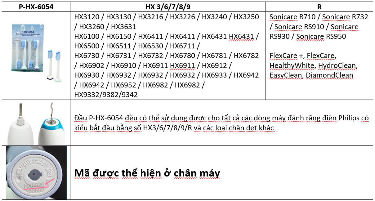 - Độ tuổi: Cho người lớn và từ 5 tuổi trở lên ✓ Bộ đầu bàn chải đánh răng điện HX-6054 cho máy Philips Sonicare được thiết kế cước mềm phù hợp cho những người răng bị nhạy cảm, răng yếu. Đầu bàn chải nhỏ sẽ dễ dàng luồn sâu bên trong làm sạch mảng bám giúp giảm cho răng sạch sẽ hoàn toàn ✓ Đạt đến 31.000 lần rung mỗi phút: Đầu chải được thiết kế viền lông độc đáo, kết hợp với tốc độ và cường độ vượt trội, bàn chải điện Sonicare giúp tối ưu hóa việc làm sạch và chăm sóc răng miệng. ✓ Có thể kết hợp với các đầu chải khác nhau: Tương thích được với tất cả các chế độ chải của máy Panasonic nữa ✓ Có thể điều chỉnh theo nhiều chế độ khác nhau: Ngoài việc làm sạch thông thường, bàn chải đánh răng điện HX-6054 Philips làm trắng, chăm sóc nướu, làm sạch lưỡi ✓ Loại bỏ mảng bám trên răng tốt hơn: Dù cho bạn có để Philips ở cường độ thấp thì nó vẫn có khả năng làm sạch gấp đôi so với bàn chải thông thường. ✓ Hiệu quả làm trắng răng bất ngờ ✓ Tác dụng kép trong việc chăm sóc cả răng và lợi của bạn: Bàn chải Philips HX-6054 được lập trình để có thể đi vào sâu tận ngõ ngách khu vực khó khăn nhất giữa răng như là răng khôn và dọc viền nướu. Từ ấy, bàn chải giúp làm sạch hoàn toàn mọi mảng bám trên răng lợi. Philips có nhiều dòng máy khác nhau như FlexCare, EasyClean, HX3/HX6/HX9… Đầu HX-6054 này phù hợp cho tất cả các dòng máy đánh răng điện Philips có kiểu bắt đầu bằng số 3/6/7/8/9/R và các loại khác chân dẹt khác. Các bạn nên xem kỹ dòng máy của mình trước khi mua hàng. Cam kết: Shop cam kết bán hàng chất lượng đúng giá và uy tín, mọi sản phẩm đều được bảo đảm theo chính sách của Tiki. Sản phẩm giống mô tả và hình ảnh