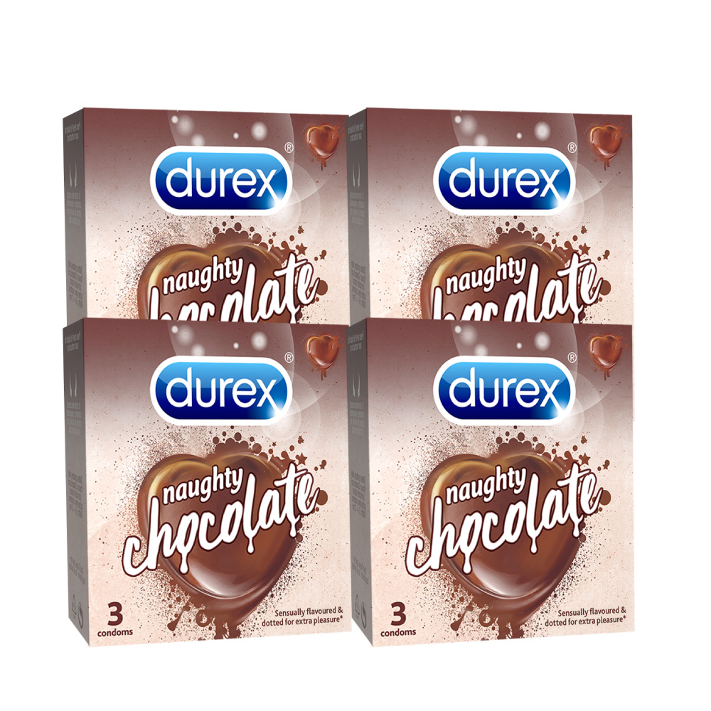 Mua tại TiktokBộ 4 hộp bao cao su Durex Naughty Chocolate hương socola, size 52mm, 3 bao/hộp