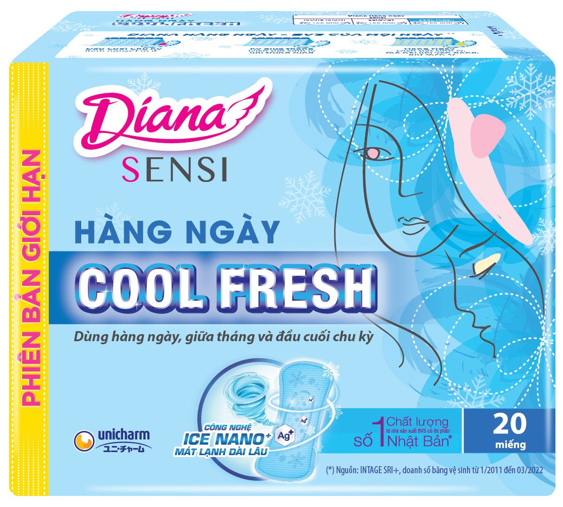 - Bộ 6 Gói Băng Vệ Sinh Diana Hàng Ngày Sensi Cool Fresh (20 Miếng/Gói) TUDN00002CB là loại băng vệ sinh đáp ứng các yêu cầu vừa mềm mại, vừa thấm hút tốt, đồng thời phải thật mỏng nhẹ như không và không co dúm của phái đẹp.