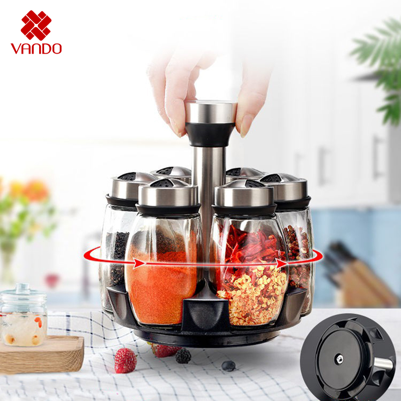 Bộ 6 lọ thủy tinh đựng gia vị kèm giá xoay 360 độ được làm bằng thủy tinh sáng bóng, thân thiện với môi trường và an toàn khi sử dụng.