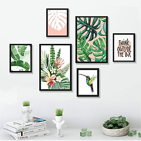 ✨Bộ 6 Tranh treo tường kèm khung màu đen, lá cây nhiệt đới, ,tông màu hồng,lá cây, chim,,, tươi sáng, hiện đại , Tặng kèm khung và đinh ba chân treo tranh chuyên dụng PVP-TP168