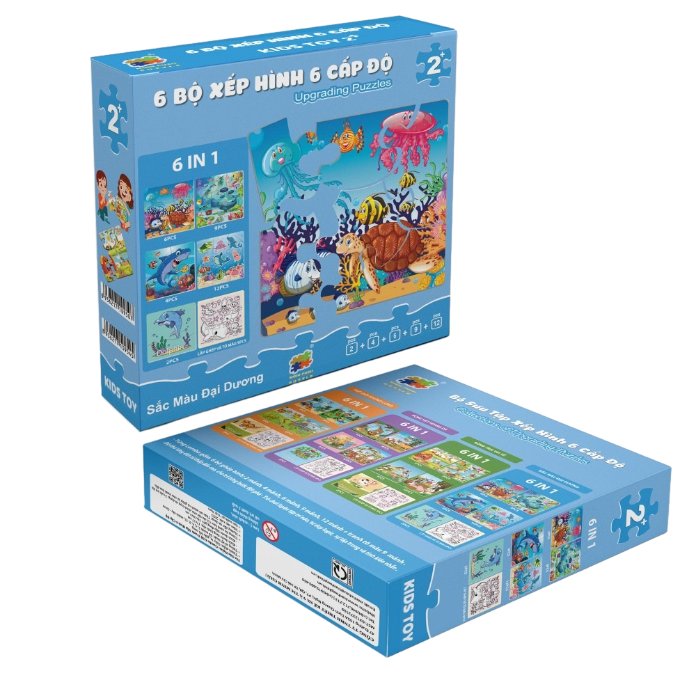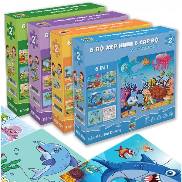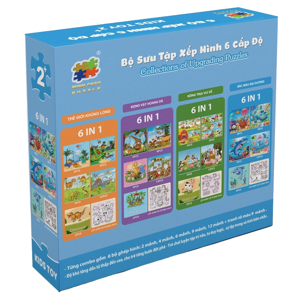Tranh có độ khó tăng dần: 2 mảnh, 4 mảnh, 6 mảnh, 9 mảnh, 12 mảnh và tranh tô màu 9 mảnh, giúp bé từng bước phát triển tư duy. Trong hộp có 2 chân đế để bàn tiện dụng cho bé trang trí tác phẩm của m.ình.