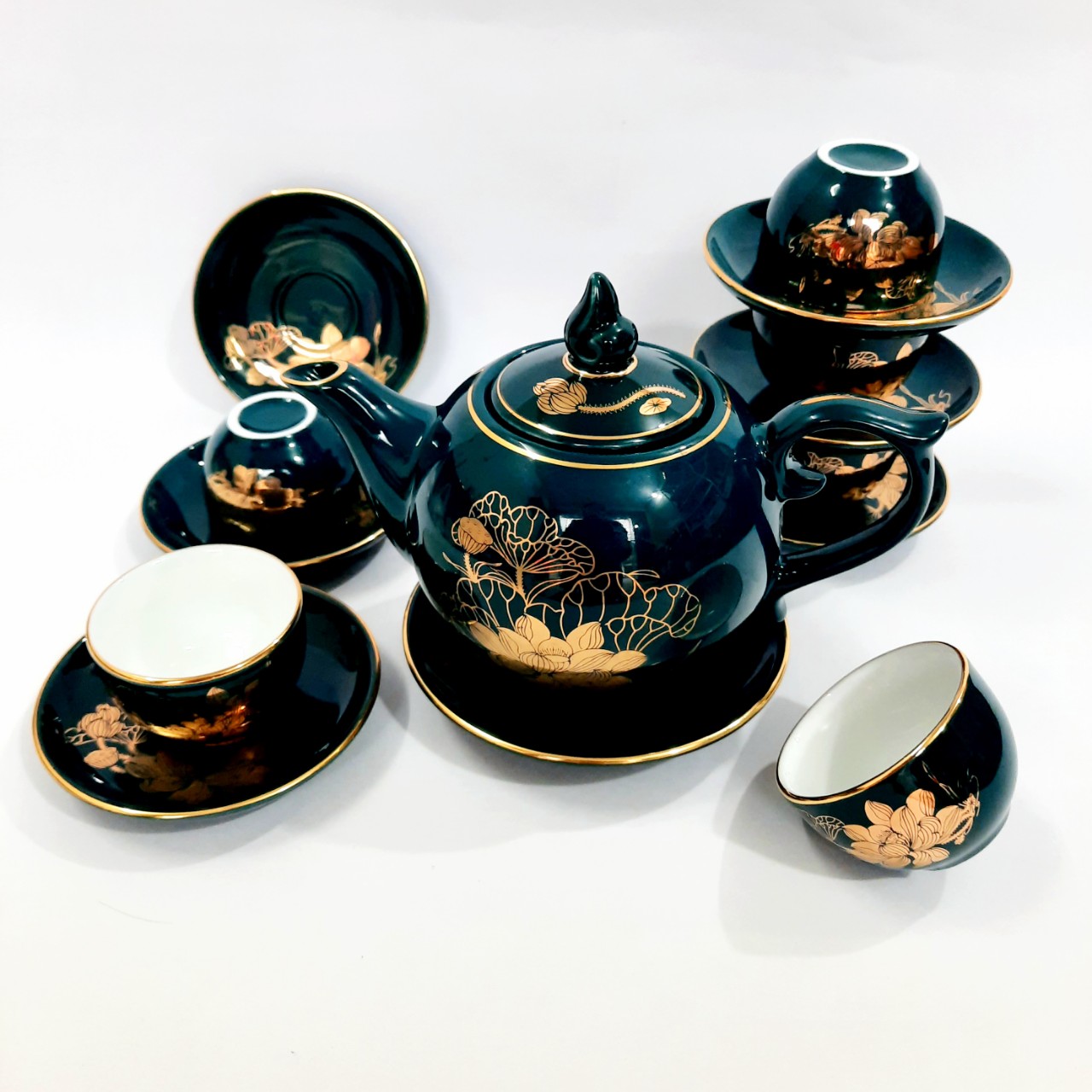 ✨Bộ ấm chén Bát Tràng cao cấp màu xanh Arctic họa tiết hoa sen vẽ vàng 24k