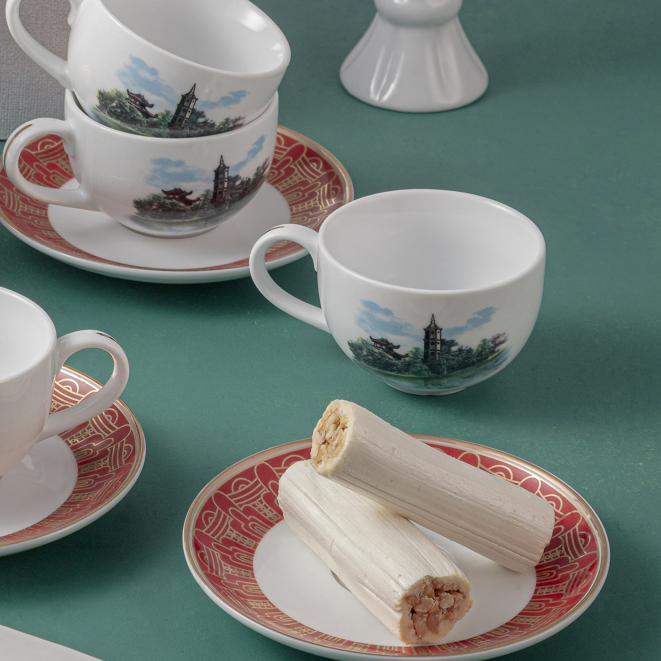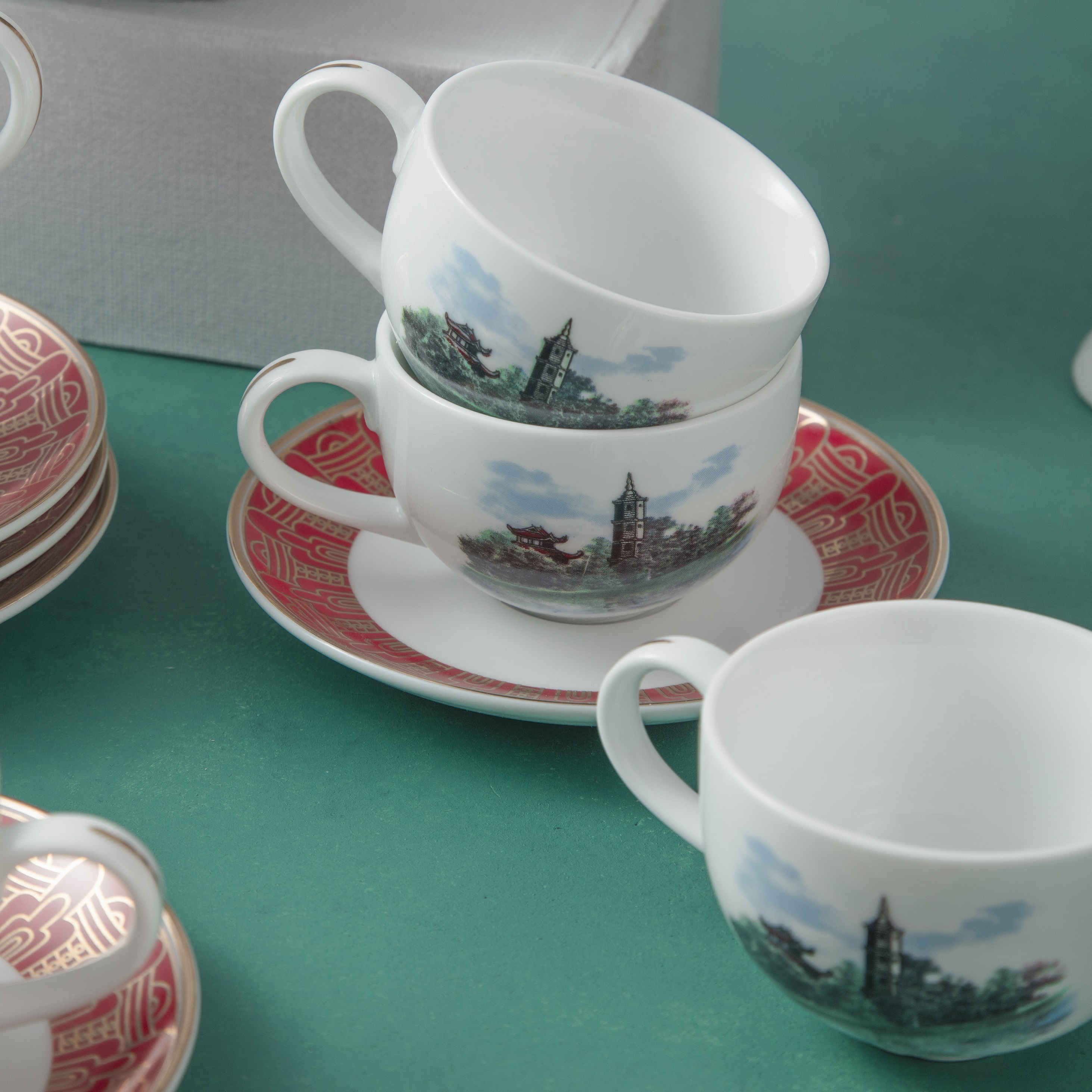 Bộ ấm chén phình thon sơn thủy được lấy cảm hứng từ ngôi cổ tự Bút Tháp, qua bàn tay khéo léo của nhưng người thợ gốm sứ Long Phương mà tạo thành.