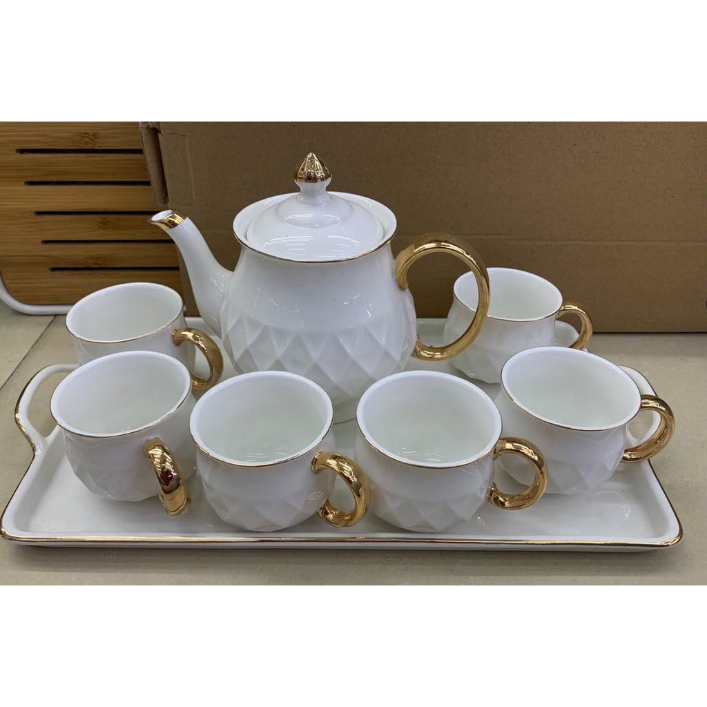 Bộ ấm chén Bát Tràng men trắng viền vàng kim dáng phú quý kèm hộp làm quà tặng sang trọng    Với chất men trắng tinh khôi không tỳ vết, từ chén, đĩa, ấm, nắp