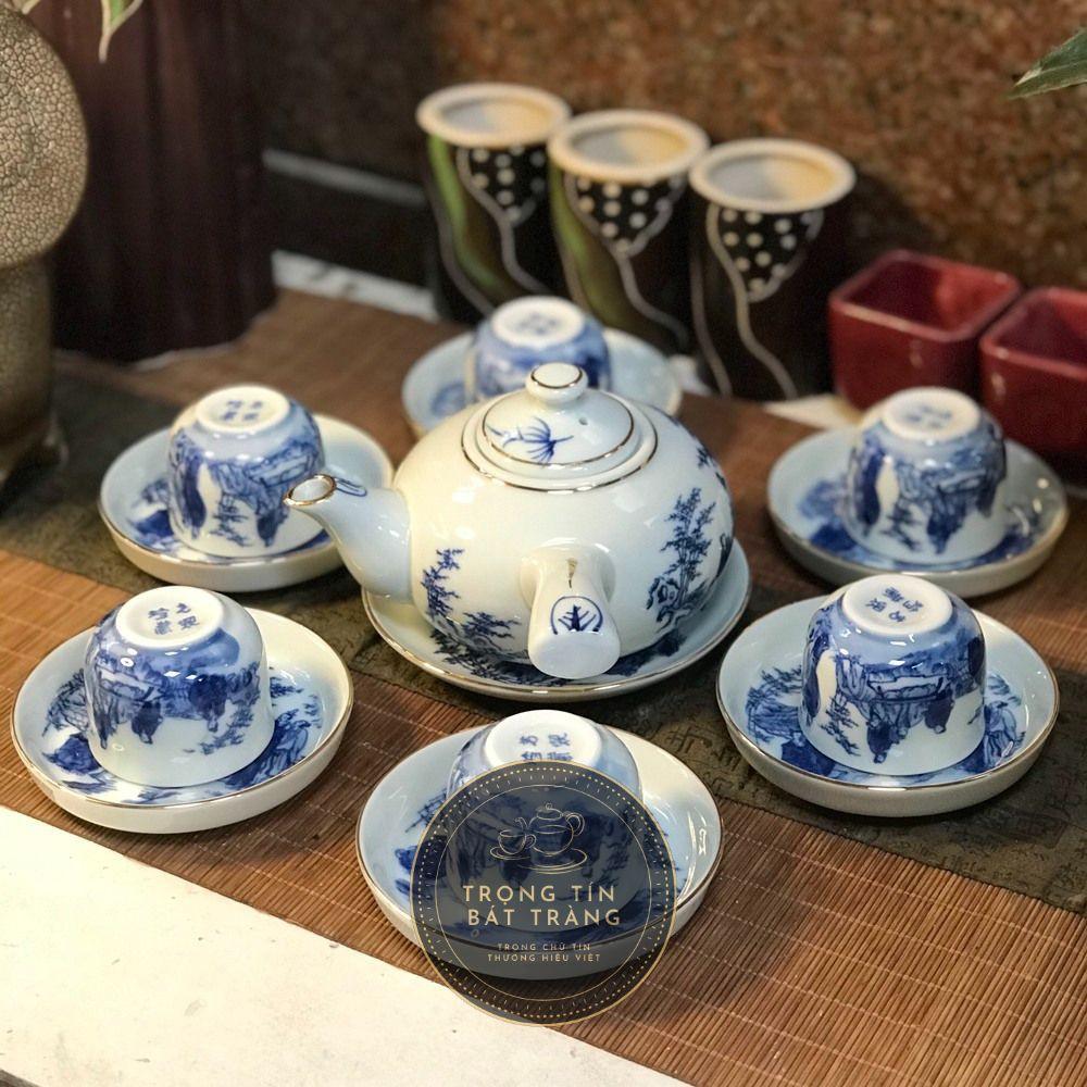 ATA 13 Bộ Ấm Chén Gốm Sứ Men Lam Bát Tràng Họa Tiết Trúc Lâm Thất Hiền Dáng Đường Vũ Dung Tích 350ml