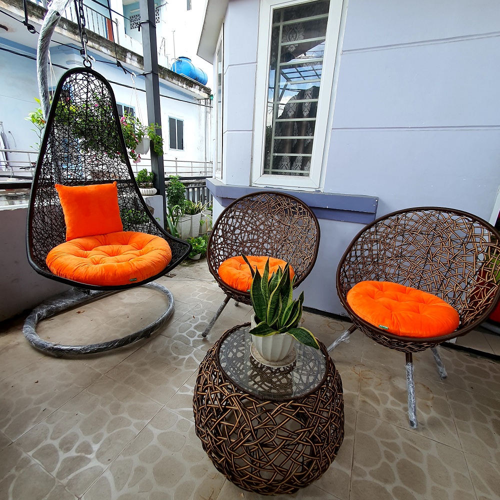 Bộ sản phẩm gồm : 01 bàn mặt kính + 02 ghế + 01 xích đu như hình Đặc biệt kèm theo bộ nệm xích đu + 02 đệm ghế chất liệu vải nhung màu