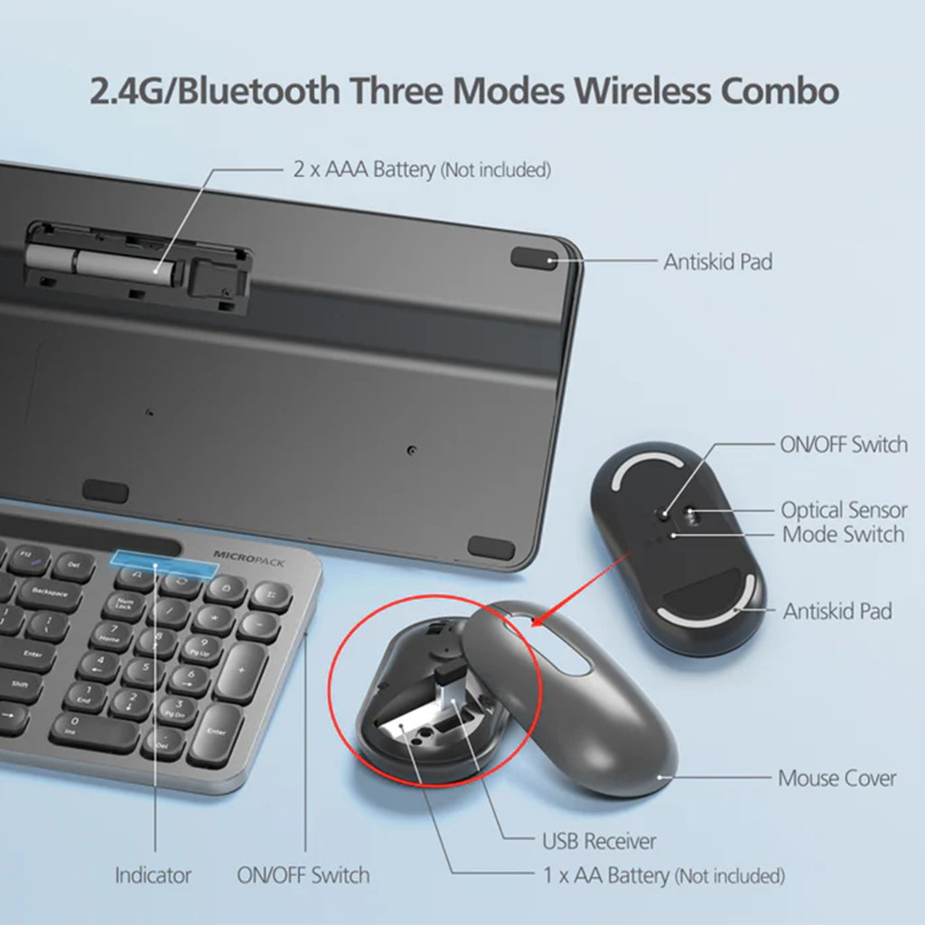 Bộ thu USB: Tiêu chuẩn với điện áp đầu vào 5V/30mA. Với thiết kế này, bạn sẽ không còn phải lo ngại về việc ngắt quãng công việc vì pin yếu. Thời gian sử dụng dài giúp bạn tập trung vào nhiệm vụ mà không bị phân tâm bởi việc phải thay pin hay sạc lại thiết bị. Sự bền bỉ và ổn định của KM-238W chính là yếu tố then chốt giúp bộ combo này trở thành lựa chọn lý tưởng cho những ai cần một thiết bị đáng tin cậy trong công việc hàng ngày. Hãy trải nghiệm sự thoải mái và hiệu quả mà sản phẩm này mang lại, giúp bạn tối ưu hóa thời gian và năng suất làm việc Tương thích linh hoạt với Mac & Windows Một trong những ưu điểm nổi bật của bộ combo bàn phím chuột không dây MicroPack KM-238W chính là khả năng tương thích rộng rãi với cả hệ điều hành Windows và Mac. Bạn chỉ cần dễ dàng chuyển công tắc để chọn chế độ tương thích mà không cần trải qua quá trình cài đặt phức tạp hay phần mềm hỗ trợ. Khả năng tương thích linh hoạt không chỉ giúp tiết kiệm thời gian mà còn nâng cao hiệu suất làm việc. Bạn có thể tập trung vào công việc mà không phải lo lắng về vấn đề tương thích thiết bị. Dù bạn đang làm việc trên Mac hay Windows, KM-238W luôn sẵn sàng hỗ trợ bạn. Thông số kỹ thuật & Chi tiết Công nghệ không dây: RF2.4GHz, BT3.0/BT5.0 Phạm vi không dây: ≦ 10m Bộ thu: Bộ thu Nano Công suất định mức: 5V/30mA (bộ thu), 3V/5mA (bàn phím), 1,5V/25mA (chuột) Bàn phím Loại công tắc: Khóa cấu trúc X Số phím: 99 Phím đa phương tiện: 12 Pin: 2 pin AAA Kích thước: 372,5x142,5x24 mm Chuột Độ phân giải: 1000-4000CPI Số nút: 4 (phím trái, phím phải, cuộn, chuyển đổi dpi) Pin: 1 pin AA Kích thước: 110x58x30,5mm Tương thích: Windows 8/10 trở lên.Mac OS X 10.10 trở lên,Android 5.0 trở lên,Chrome OS Bảo hành 1 năm Bộ sản phẩm bao gồm: 1. Chuột không dây 2. Bàn phím không dây 3. Hướng dẫn sử dụng 4. 1 pin AA 5. 1 pin AAA 6. Thẻ bảo hành