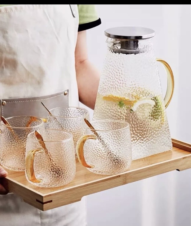 ✨BỘ BÌNH ĐỤNG NƯỚC UỐNG THỦY RINH ĐÁY VUÔNG VÂN DẬP NỔI KÈM 6 CỐC BẦU, KHAY VÀ GIÁ TREO CỐC -VD107