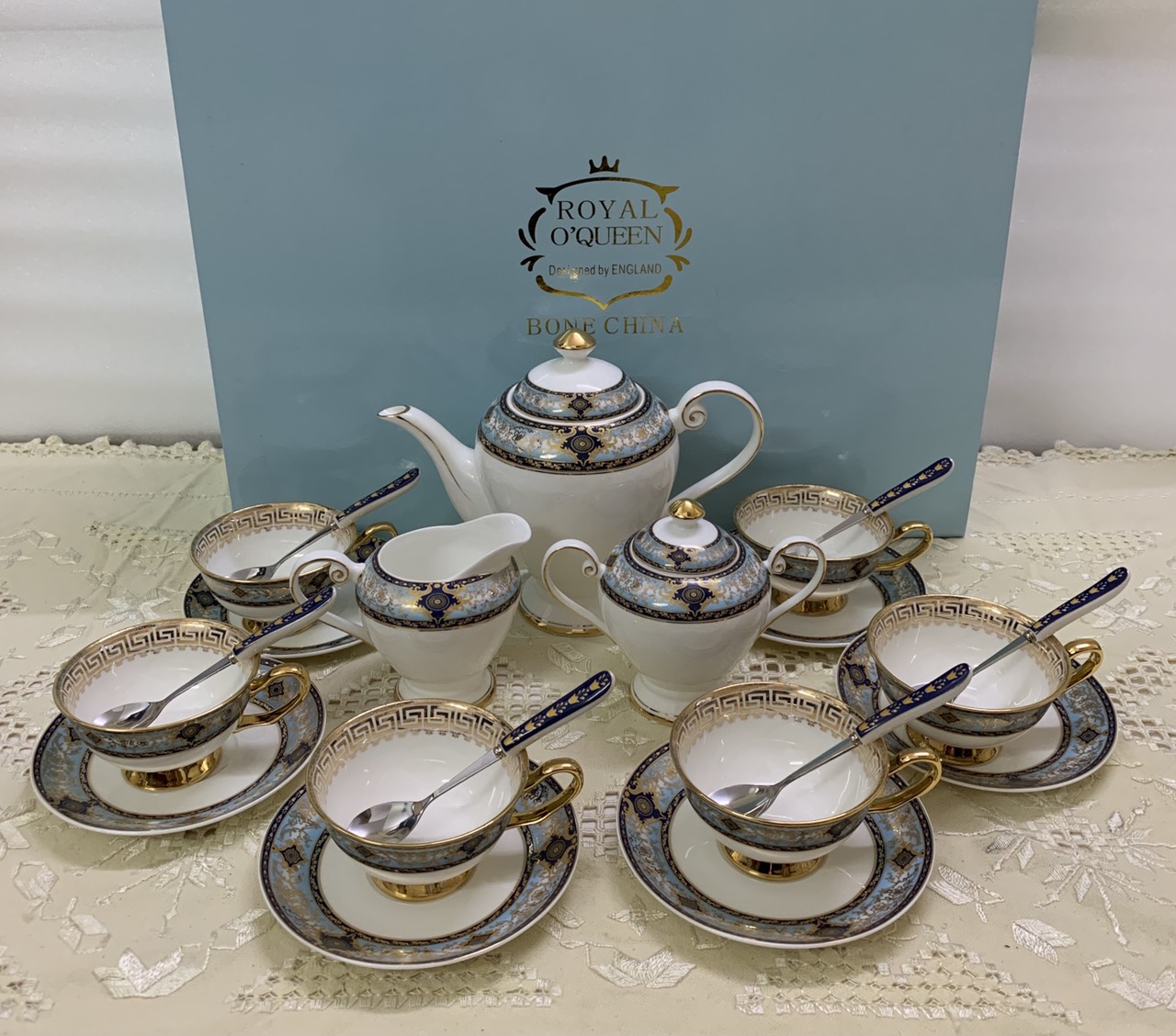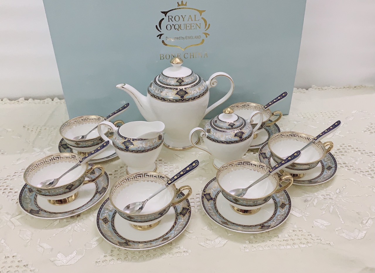 ✨BỘ BÌNH TRÀ CÀ PHÊ SỨ XƯƠNG CAO CẤP TRẮNG VIỀN XANH GHI - VD32