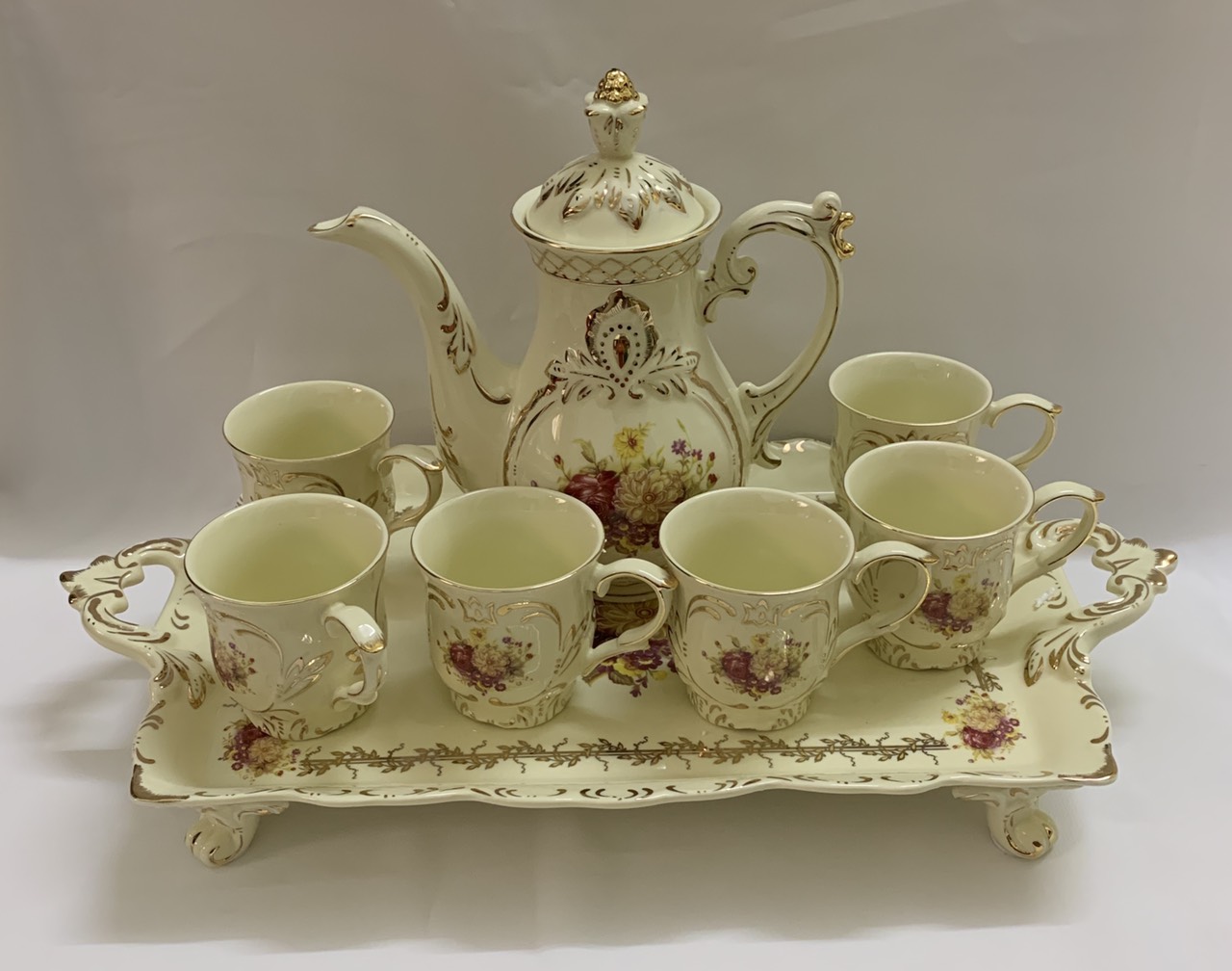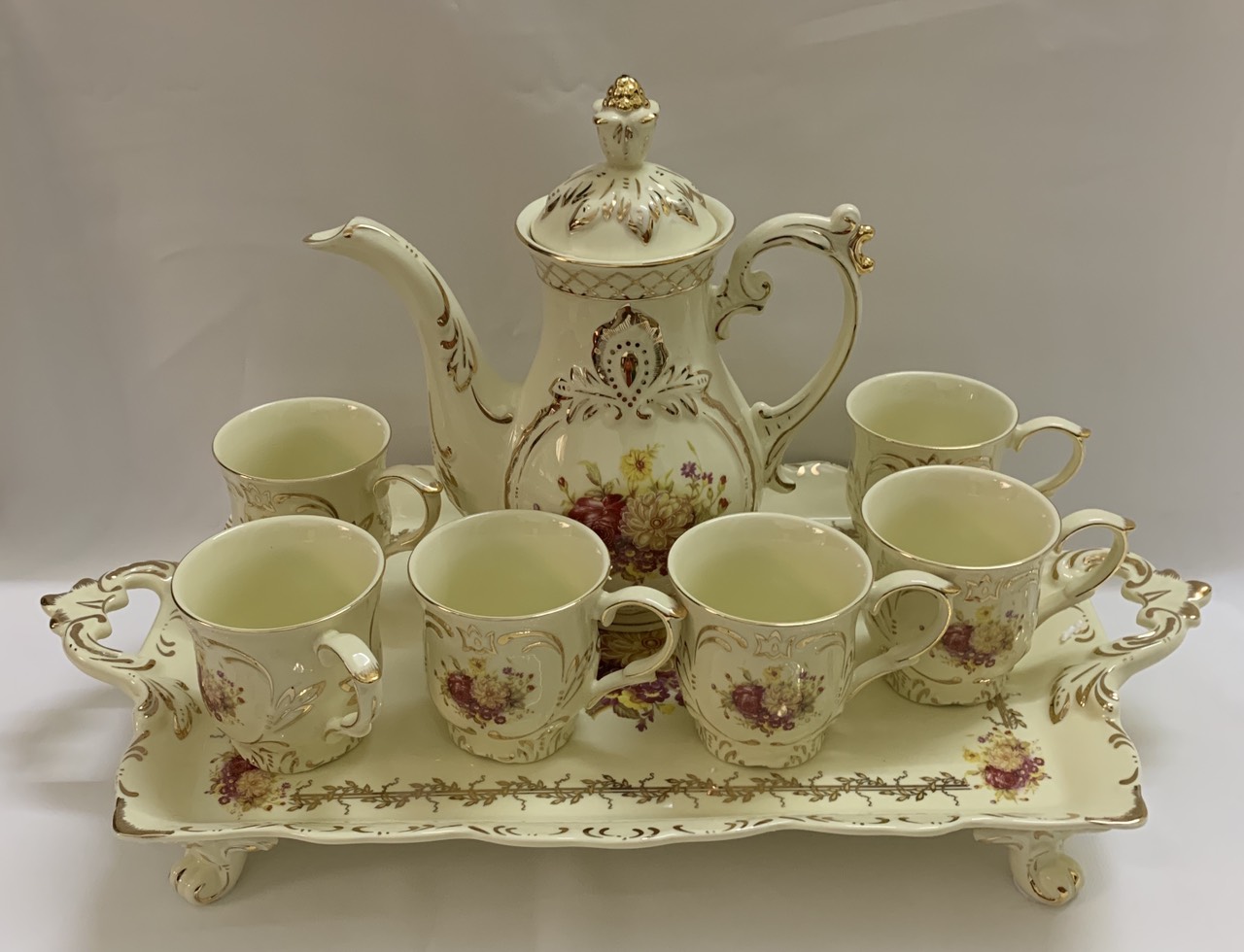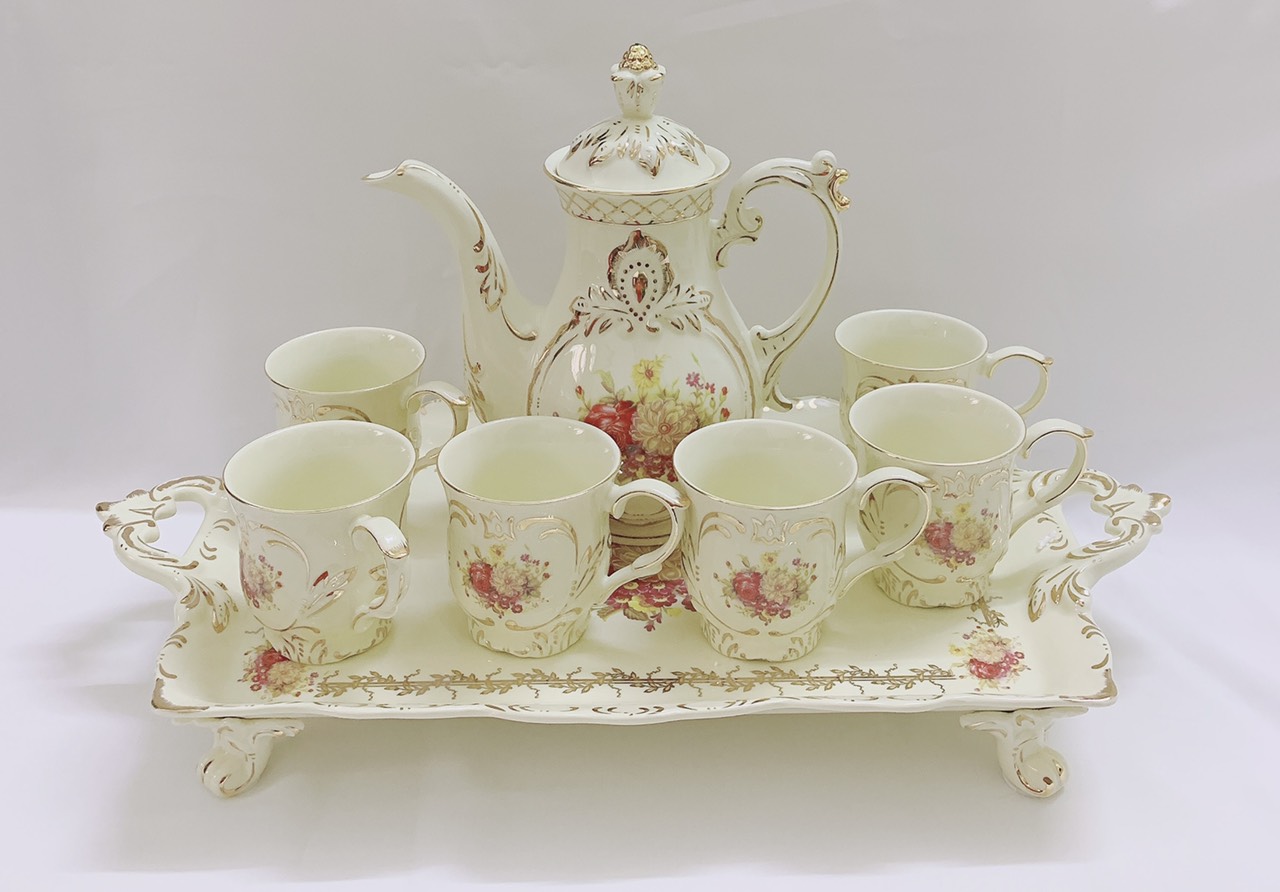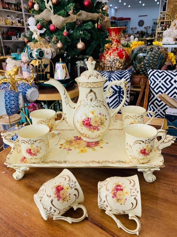 Mua tại TiktokBộ gồm: • 1 Khay sứ • 1 Ấm pha trà pha cà phê. • 6 Cốc uống trà.