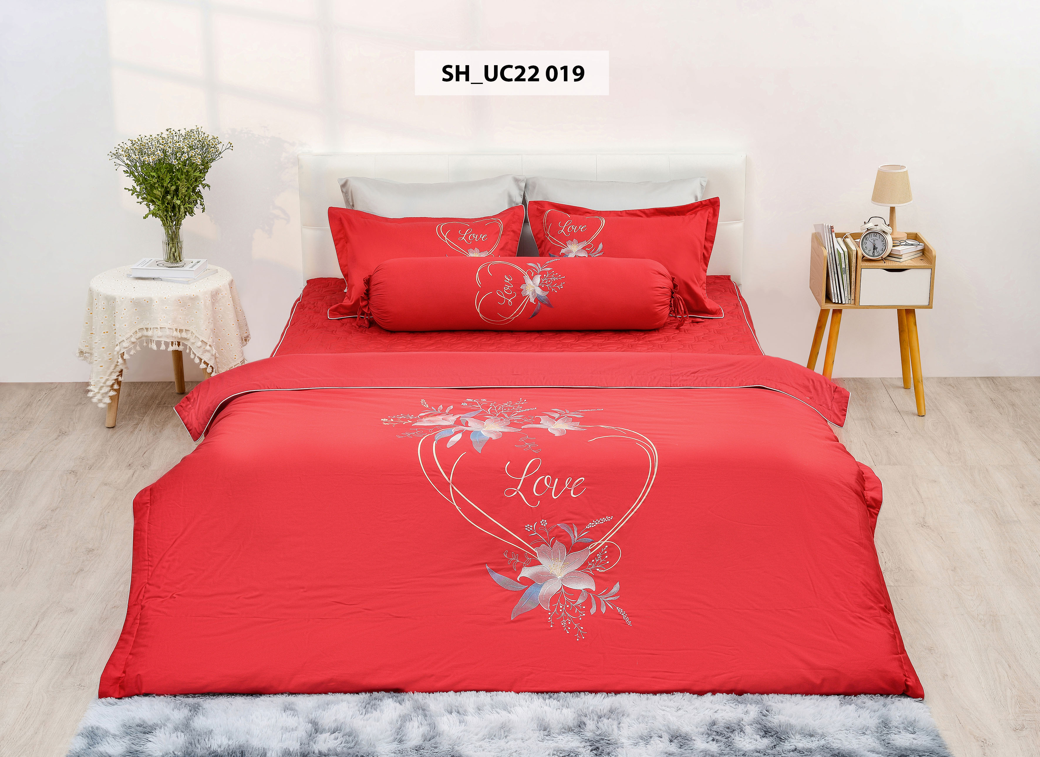 - Màu sắc:Tươi sáng,trẻ trung ,hiện đại được thiết kế với các họa tiết thêu tinh tế nhẹ nhàng và sang trọng. Bộ sản phẩm cao cấp Urban collection là làn gió mới cho căn phòng đầy yêu thương thoải mái hướng đến giấc ngủ xanh và hoàn hảo sau một ngày dài với công việc.Sự đa dạng về kiểu dáng, chất liệu, kích thước đến màu sắc mang lại nhiều lựa chọn cho gu thẩm mỹ của mỗi khách hàng.Với những cải tiến cập nhật và ứng dụng xu thế thiết kế mới nhất,không gian phòng ngủ của bạn không chỉ sang trọng ,đẳng cấp mà còn tràn ngập sự ấm áp yêu thương. UC22 019: Với chủ đích thiết kế cho các cặp tình nhân, bộ UC22 019 lấy gam màu đỏ là chủ đạo, nền tảng cảm hứng Romantic với dòng chữ thêu Love được bao bọc bởi hình trái tim, tạo cho bộ thiết kế thêm mềm mại. HƯỚNG DẪN SỬ DỤNG: