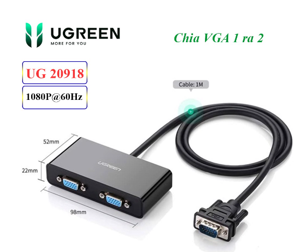 Mua tại TiktokBộ chia VGA 1 ra 2 Ugreen 20918 - Hàng chính hãng Bộ chia VGA 1 ra 2 cao cấp Ugreen 20918 hỗ trợ độ phân giải lên đến 1920×1440@60Hz với băng thông rộng tới 250Mhz. Được sản xuất bằng nguyên vật liệu bao gồm lõi cáp bằng đồng nguyên chất và các vi xử lý cao cấp mang đến khả năng chia tín hiệu vga ra 2 màn hình mà vẫn giữ nguyên chất lượng hình ảnh, là thiết bị hoàn hảo cho các nhu cầu giải trí, làm việc… Thông số kỹ thuật Ugreen 20918