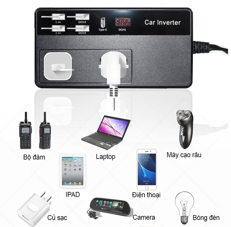 Biến tần có thể chuyển đổi DC thành điện áp xoay chiều 110 V / 220 V và đầu ra USB là DC 5V. Dễ dàng kết nối với ắc quy xe thông qua bật