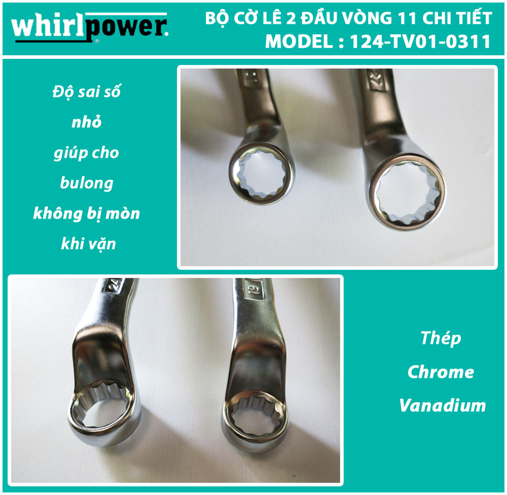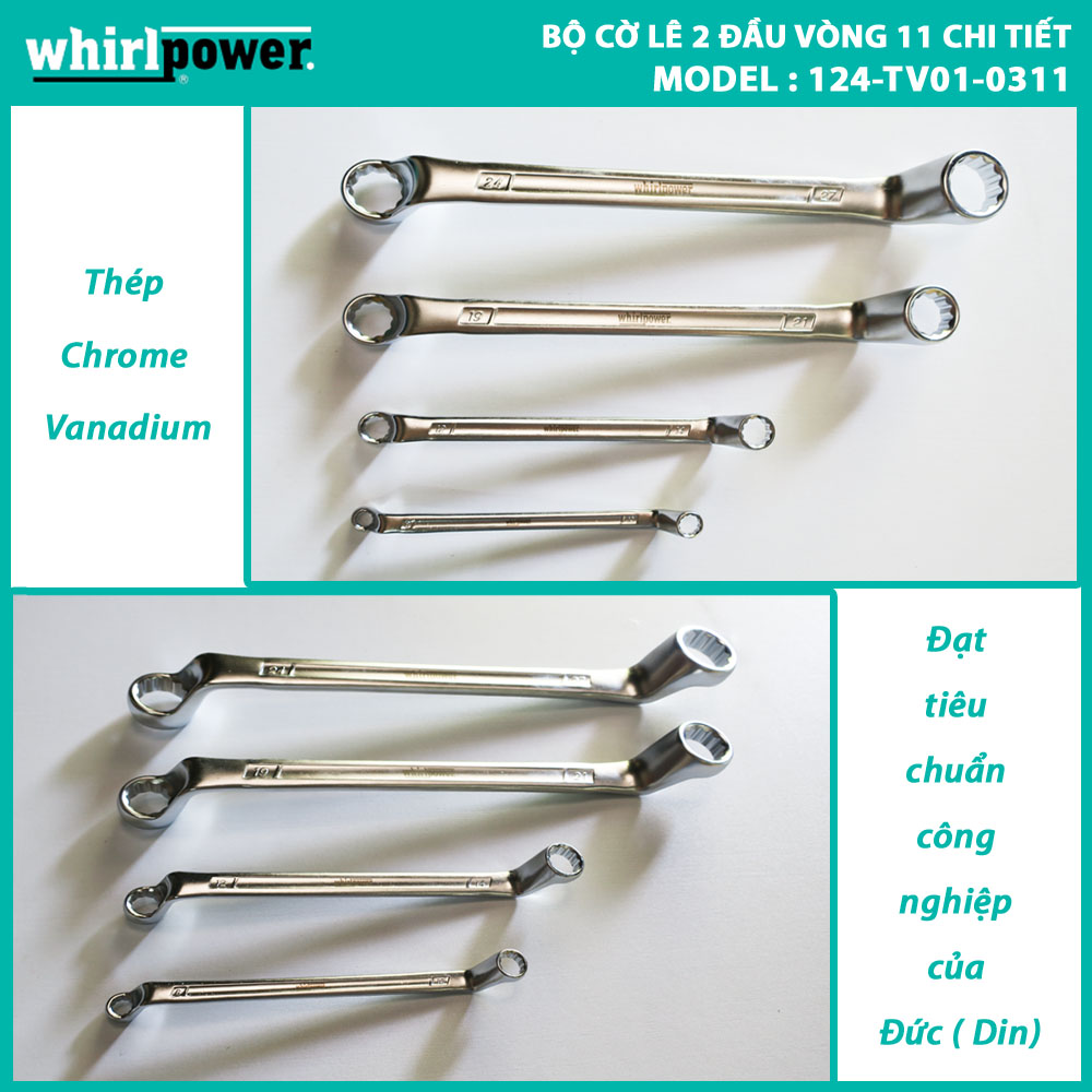 - Bộ cờ lê 2 đầu vòng 11 chi tiết của Hãng Whirlpower 124-TV01-0311 đạt tiêu chuẩn công nghiệp của Đức ( Din). Với độ sai số nhỏ giúp cho bulong không bị mòn khi vặn.