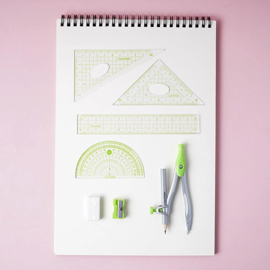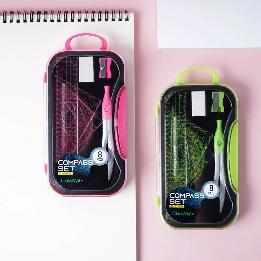 Bộ Compas 8 Món ClassMate CL-CM212 Sản phẩm an toàn tuyệt đối khi sử dụng. Bề mặt compa sử dụng sơn kim loại cao cấp, các chi tiết còn lại có thước thẳng, eke, đo