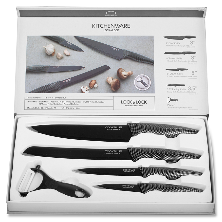 Bộ dao nhà bếp 5 món Lock&Lock COOKPLUS CKK101S5BLK - Hàng chính hãng lưỡi dao bọc sứ, có hộp sang trọng - JoyMall