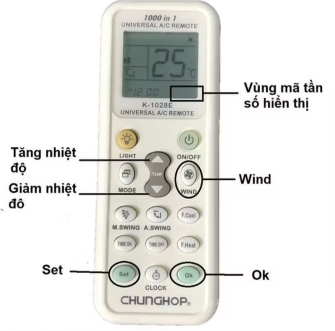 B3: Bấm nút “SET” 1 lần nữa, điều khiển sẽ tự động chạy dò mã bắt đầu từ 000 đến 999.Khi nào thấy điều hòa có tiếng kêu tít tít là đã dò đúng mã.(Chú ý:Khi điều khiển dò đúng mã của điều hòa nhưng vì dò tự động nên mã vẫn nhảy liên tục đi lên ví dụ mã là 456 nhưng lại vẫn dò lên cao hơn là 500.Ấn phím điều chỉnh nhiệt độ xuống ▼ khi nào thấy kêu tít tít là đúng mã).B4: Bấm nút “OK” để xác nhận, khi đó tần số được xác lập và mã tầng số sẽ hết nhập nháy.B5: Kiểm tra xem các nút trên điều khiển đã hoạt động.