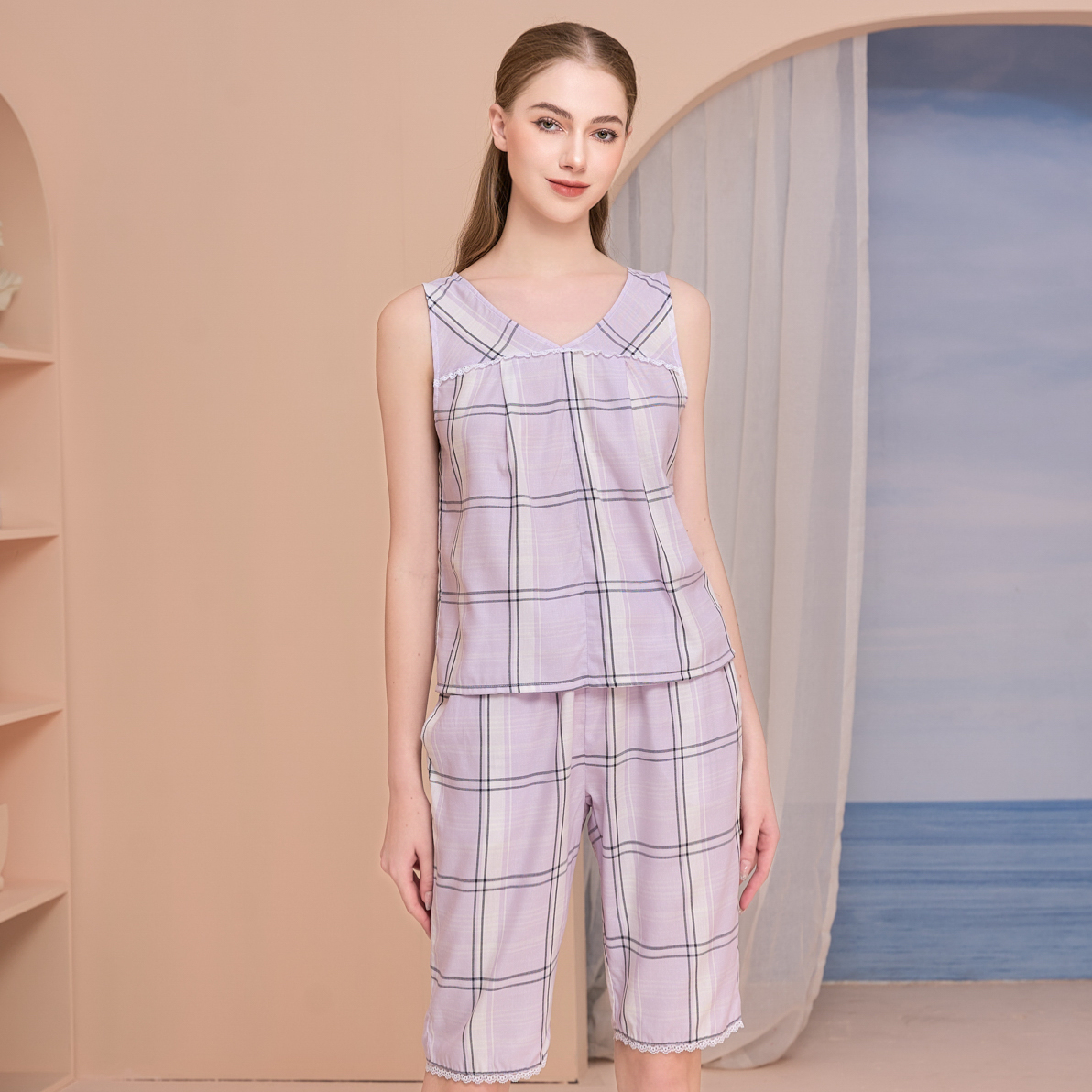 Đồ bộ nữ,đồ ngủ mặc nhà lửng 9 tấc vải lụa mango họa tiết sọc caro dễ thương size 45-57kg. Chất : lụa mềm mịn,mát,không nhăn không xù ,họa tiết caro siêu xinh. FreeSize :45-57kg