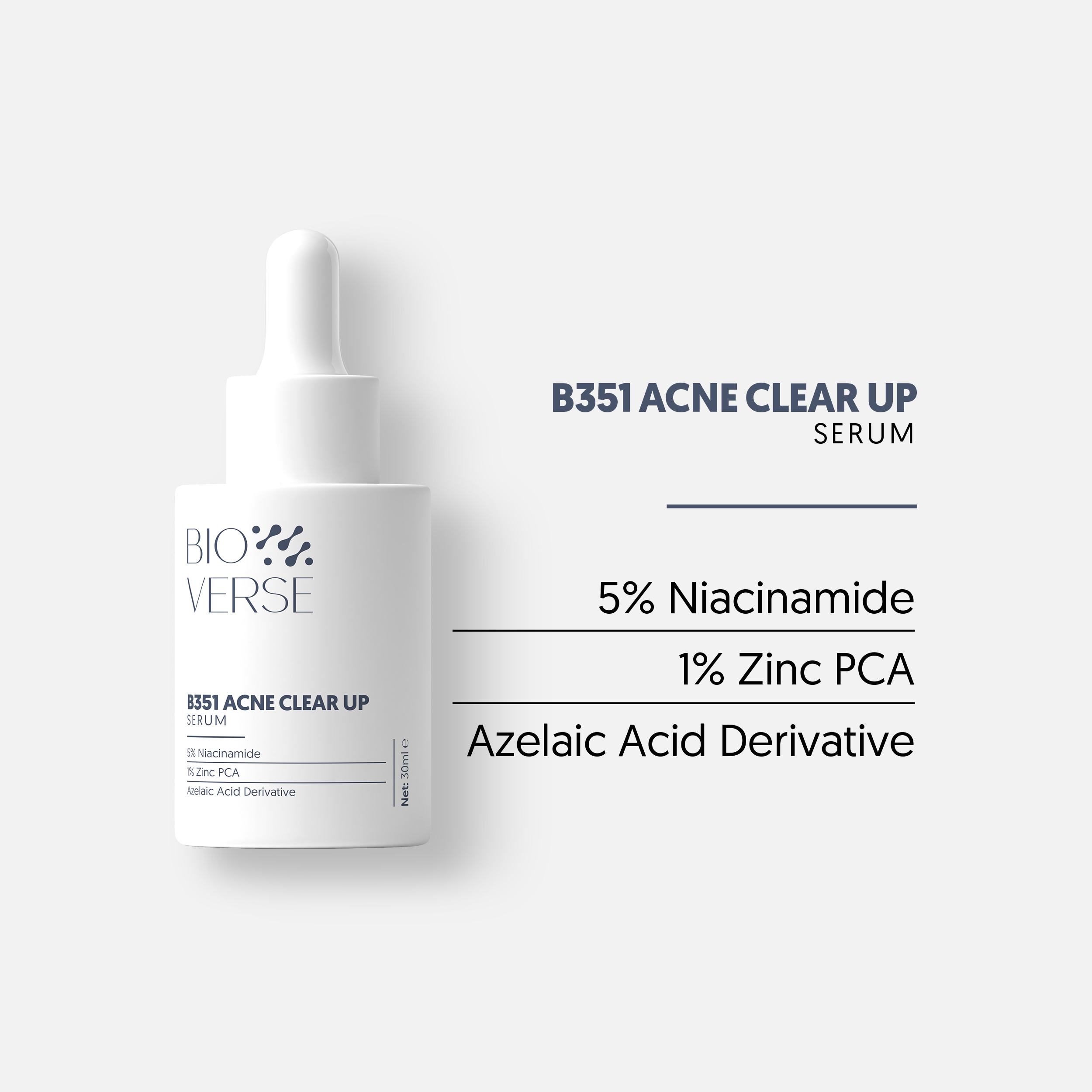 - Tinh chất B351 Acne Clear up Serum là sản phẩm được Bioverse ra đời để hỗ trợ giảm mụn, cải thiện đa vấn đề cho da mụn. Với công thức gồm 5% Niacinamide + 1% Zinc, tinh chất giúp làm dịu các vết thâm hỗ trợ da đều màu và sáng khỏe.
