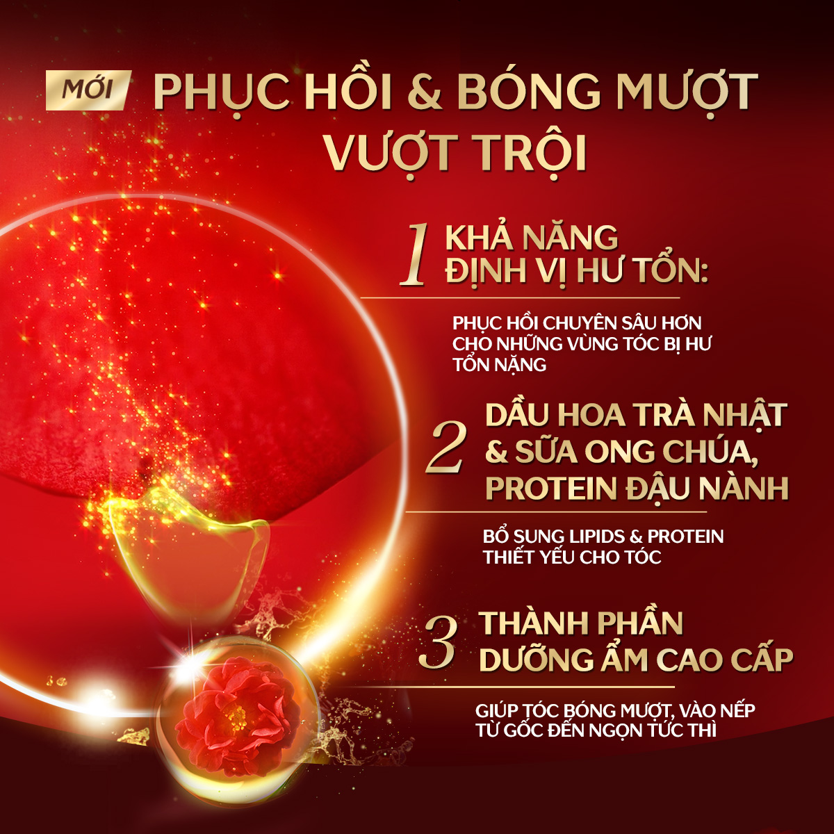 Dưỡng chất thiết yếu (thành phần phục hồi + thành phần nuôi tóc bóng mượt) dễ dàng di chuyển và thấm sâu vào biểu bì tóc.