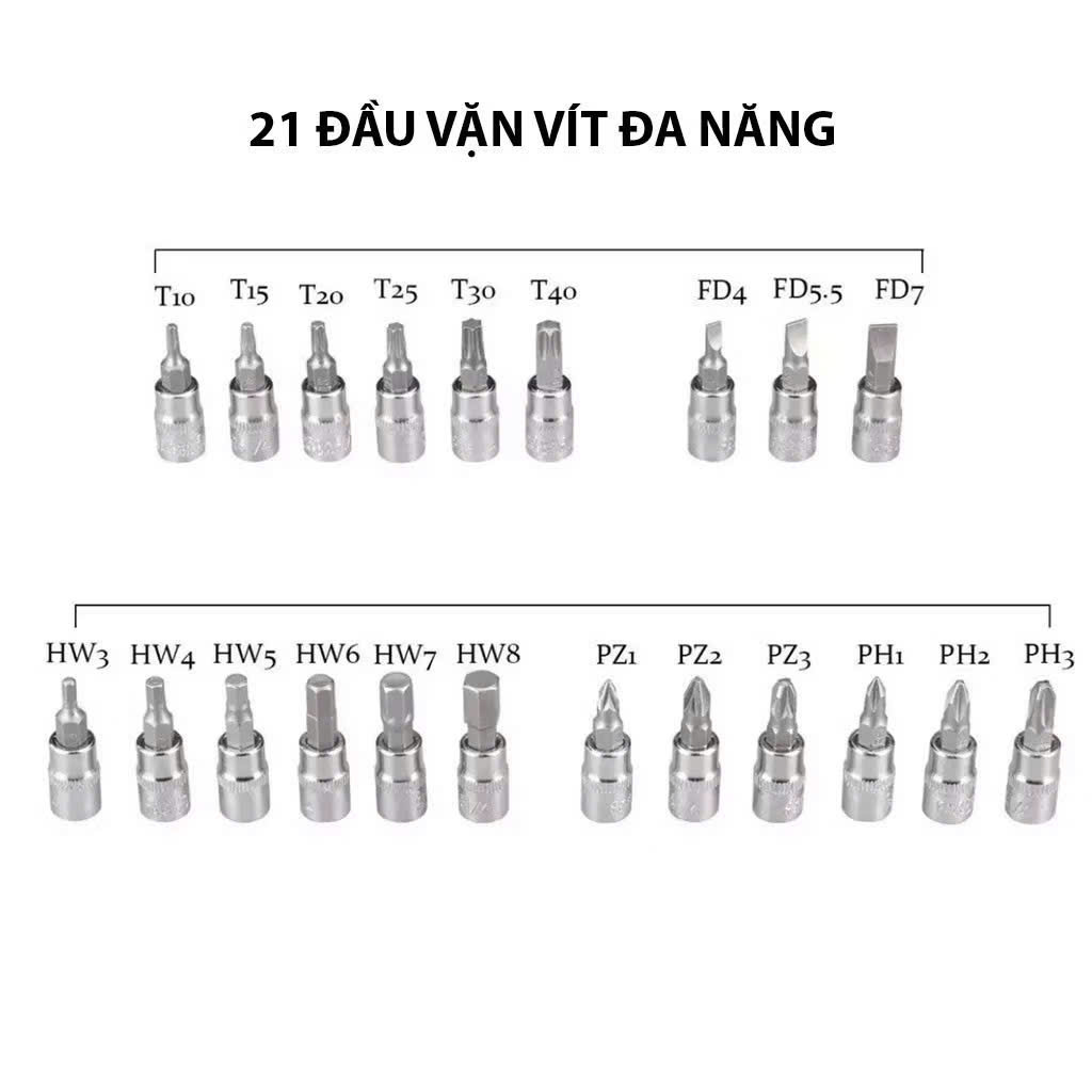- 21 đầu bắt mở vít: Các loại vít 2 cạnh, 4 cạnh, 6 cạnh,...