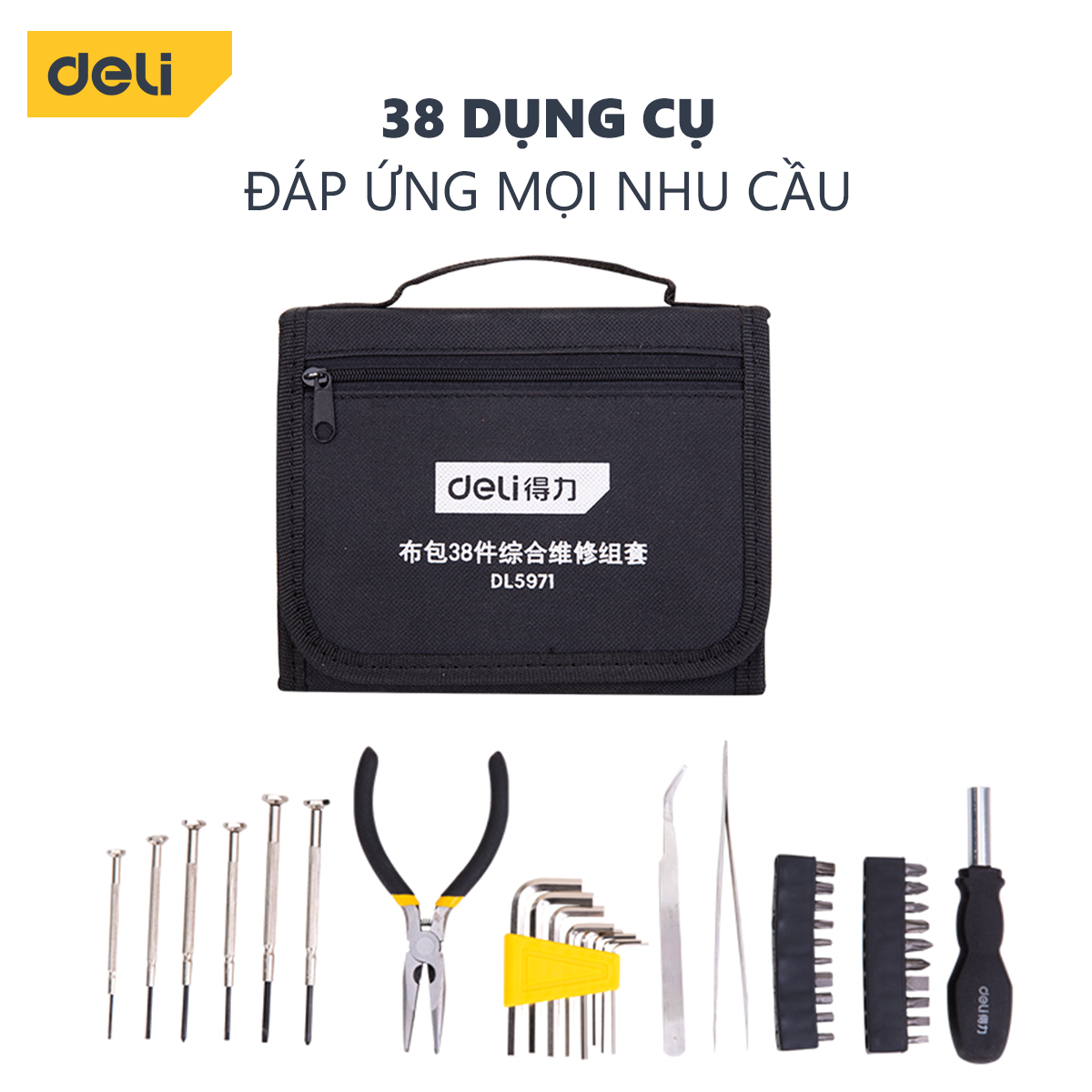 ✨Bộ Dụng Cụ Sửa Chữa Deli 38 Chi Tiết Cao Cấp - Sử Dụng Nhiều Mục Đích - Túi Vải Tiện Lợi, Dễ Dàng Mang Theo - DL5971