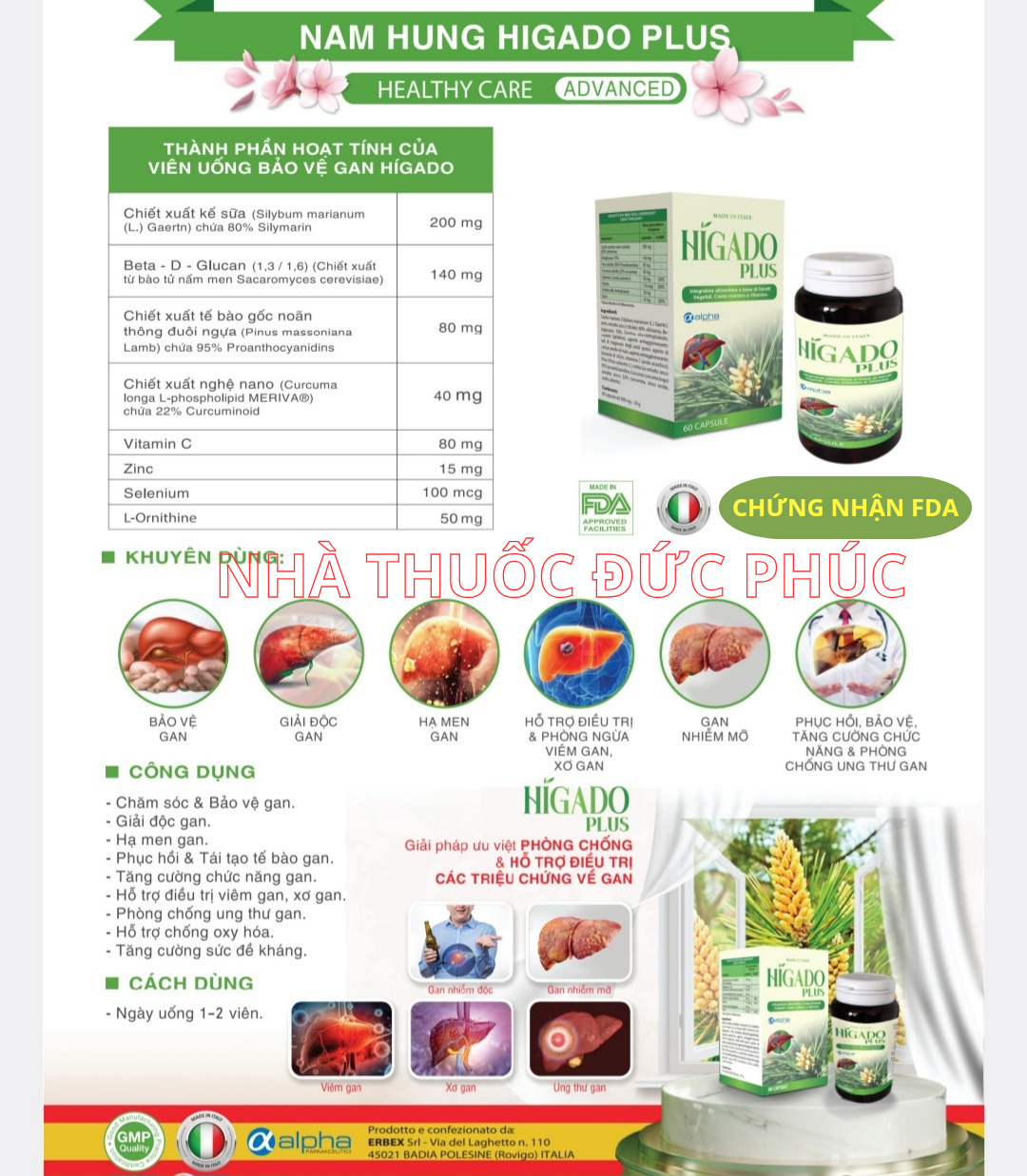 - Selen (từ Natri selenite): 110 mcg Phụ liệu: Vỏ nang (gelatin), chất chống đông vón (muối magie của axit béo, silicon dioxide), chất độn ( tịnh bột ngô) CÔNG DỤNG: Bổ sung Silymarin, betaglucan, vitamin C và một số khoáng chất cho cơ thể. Hỗ trợ tăng cường sức đề kháng, giúp chống oxy hóa, hỗ trợ giải độc gan, bảo vệ gan, hạ men gan, gan nhiễm mỡ, hỗ trợ chức năng gan. CHÚ Ý: Thực phẩm này không phải là thuốc, không có tác dụng thay thế thuốc chữa bệnh. Người mẫn cảm, kiêng kỵ với bất kỳ thành phần nào của sản phẩm. Để xa tầm tay trẻ em dưới 3 tuổi. ĐỐI TƯỢNG SỬ DỤNG: Người trưởng thành cần tăng cường sức khỏe, người cần tốt cho gan. CÁCH DÙNG: Uống 1-2 viên mỗi ngày HẠN SỬ DỤNG: 36 tháng kể từ ngày sản xuất. Ngày sản xuất và hạn sử dụng được ghi trên bao bì sản phẩm. Sản phẩm không phải là thuốc,không có tác dụng thay thế thuốc chữa bệnh! Nhà sản xuất : Erbex Srl Địa chỉ: Via del Laghetto, 110-45021 Badia Polesine, Italy. Chủ sở hữu:Alpha phẩmcetici Srl Địa chỉ: Via Bozzine, 3-37135 Verona (VR),Italy. Thương nhân nhập khẩu,công bố sản phẩm: CÔNG TY CỔ PHẦN DƯỢC PHẨM NAM HƯNG