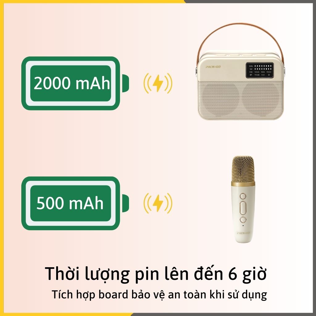 Dung lượng pin lớn cho cả loa và micro, đáp ứng hoàn hảo các buổi hát xuyên đêm.