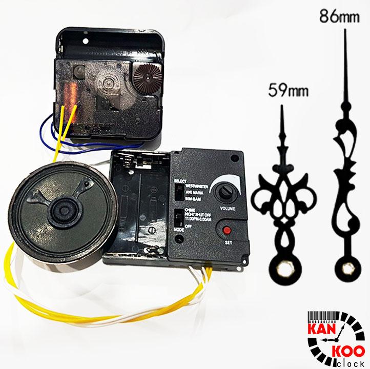 Bộ máy đồng hồ treo tường phát nhạc gồm 4 món: - 1 Máy đồng hồ treo tường 12888 hoặc M2188 có dây đấu vào bộ phát - Máy phát nhạc loại tốt: 3 bản