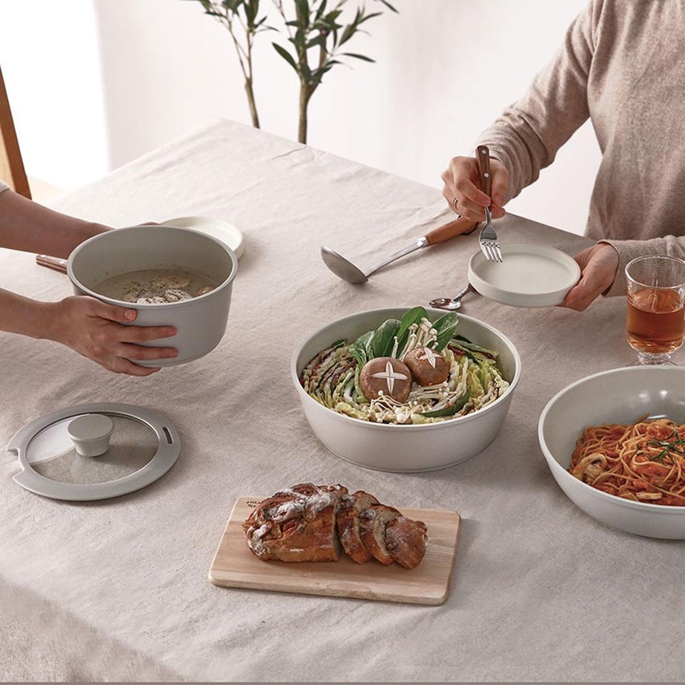 Bộ nồi nhà bếp Ceramic tay cầm rời từ tính cao cấp hiệu PoongNyun Series Bliss Naran 6 lớp kim loại được phủ 2 lớp gốm Ceramic dầy 2.5mm chống dính, chống trầy xước màu xám Warm Gray với công nghệ tráng men hiện đại nhất “Hard Anodized” không tróc men, chống gỉ sét, chống ăn mòn, giữ và gia nhiệt lâu hơn giúp thức ăn mau chín tiết kiệm thời gian và nhiên liệu, thiết kế nắp kiếng chịu nhiệt chống trào, tay cầm rời có khóa an toàn kép, chống nóng chịu được trọng lượng 10kg, sử dụng trên bếp gas, bếp hồng ngoại, bếp từ, lò nướng, gồm 06 món (1 nồi quánh 18cm và 1 nắp kiếng chịu nhiệt 18cm + 1 nồi lẩu 24cm và 1 nắp kiếng chịu nhiệt 24cm + 1 chảo sâu 26cm + 1 tay cầm).