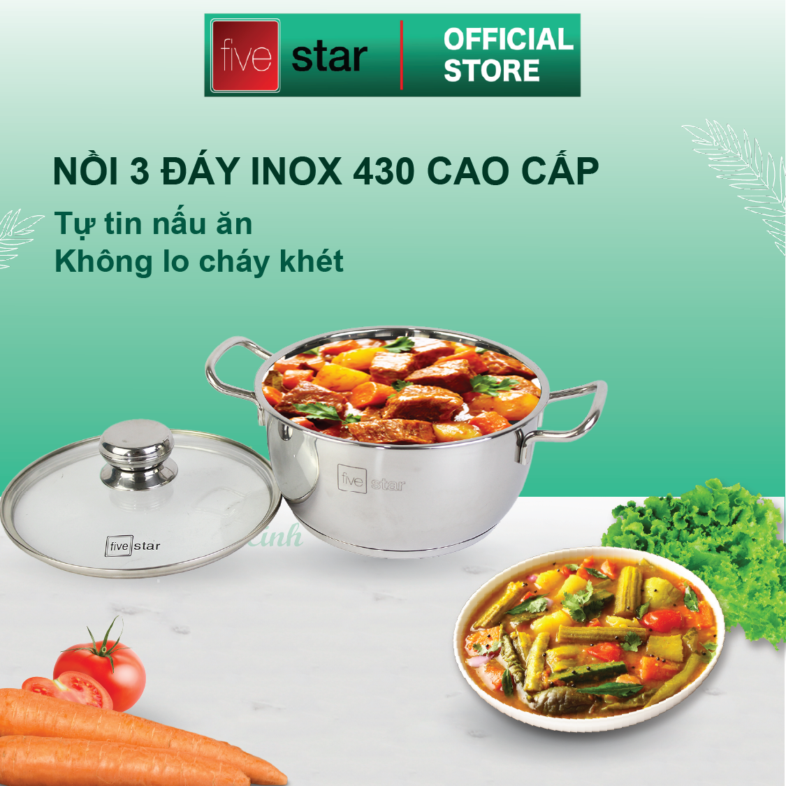 Nồi inox 3 đáy Fivestar FSN 24cm nắp inox đến từ thương hiệu Fivestar nổi tiếng Việt Nam, sản xuất tại Việt Nam. Nồi có thiết kế sang trọng với kích cỡ 24cm được làm từ chất liệu