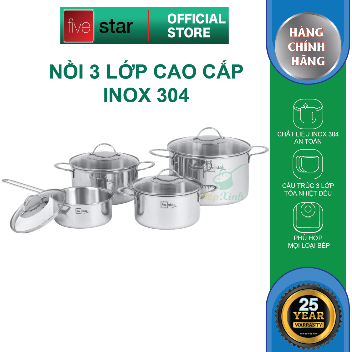 Bộ Nồi Chảo 3 Đáy Inox 430 Cao Cấp Fivestar Standard 6 món nắp kính , tặng 5 muỗng ăn
