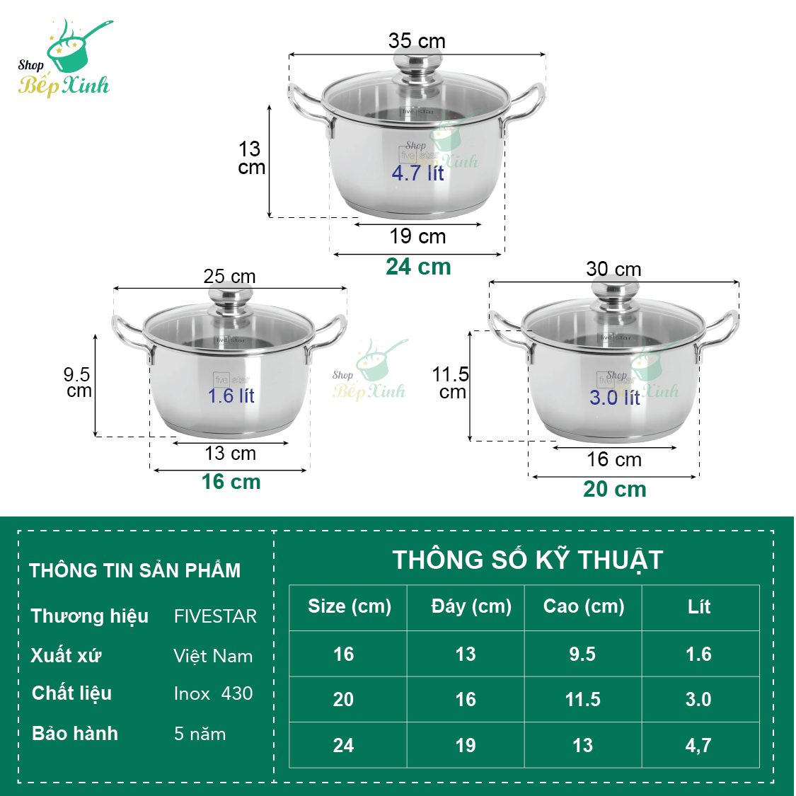 Nồi Inox 304 chống dính 3 đáy Fivestar 20cm dùng bếp từ, chính hãng bảo hành 60 tháng #sanhangre