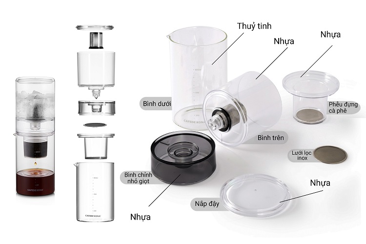 BỘ PHA CÀ PHÊ LẠNH NHỎ GIỌT PHIÊN BẢN MỚI CAFE DE KONA Thiết kế hình trụ phiên bản mới với nhiều sự nâng cấp đáng giá từ 2 sản phẩm cold drip trước đây đã rất thành công, luôn thuộc hàng best-seller và đã làm thay đổi thói quen uống cà phê của người Việt. Sự thay đổi mang lại nhiều ưu điểm mới Các chi tiết lắp ghép vừa khớp nhau thành một bộ pha hoàn chỉnh, luôn sẵn sàng để bạn sử dụng bất kỳ lúc nào. Với phần bình trên đựng nước đá và phễu đựng cà phê bột bằng nhựa thực phẩm bền đẹp theo thời gian. Bình thủy tinh đựng cà phê với chất liệu thủy tinh chịu nhiệt Borosilicate. Bề mặt bình đựng cà phê nhẵn mịn với độ trong suốt tuyệt đối. Giúp bạn quan sát quá trình trích xuất 1 cách rõ nét nhất. Lưới lọc mật độ cao, loại bỏ hầu hết cặn cà phê trong quá trình chiết xuất. Van điều tiết tốc độ nhỏ giọt sẽ giúp bạn kiểm soát 100% thời gian ủ cà phê. Ống dẫn điều chỉnh dòng nước với 4 mức độ nhỏ giọt đơn giản bằng cách xoay theo chiều kim đồng hồ và ngược lại. Hương vị tuyệt vời đặc trưng, không thua kém cà phê được pha từ các tháp cold drip khổng lồ. Kích thước nhỏ gọn, dễ dàng mang đi. Dùng cho cá nhân 2-4 người. Dễ dàng sử dụng, vệ sinh lau chùi chỉ trong 1 nốt nhạc.