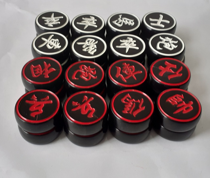 - Quân cờ sừng đên hai bên, 16 quân chữ mầu trắng và 16 quân chữ mầu đỏ, quân cờ sừng trâu đen.