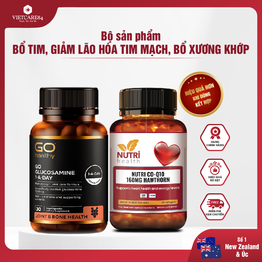 Thực phẩm bảo vệ sức khỏe Bộ Sản Phẩm Bổ Tim, Bổ Xương Khớp New Zealand: 2 Hộp Bổ Tim Nutri Co Q10 160g Hawthorn -30 Viên; Go Glucosamine 1-A-Day 1500mg 60 Viên Dùng trong
