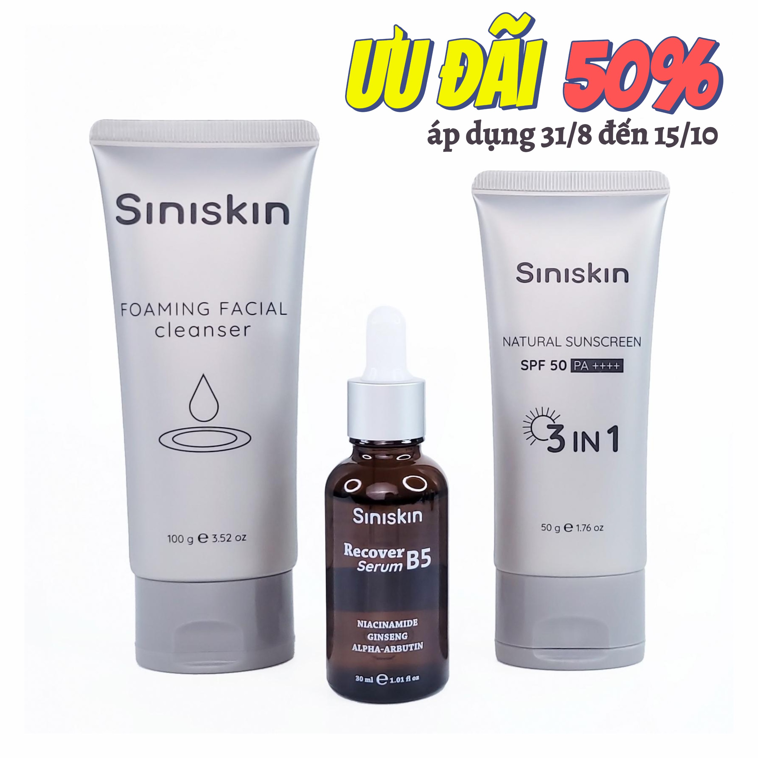 ✨Bộ sản phẩm chăm sóc da Siniskin "Serum phục hồi da Recover B5, Kem Chống Nắng nâng tone tuje nhiên, Sữa Rửa Mặt tạo bọt dịu nhẹ